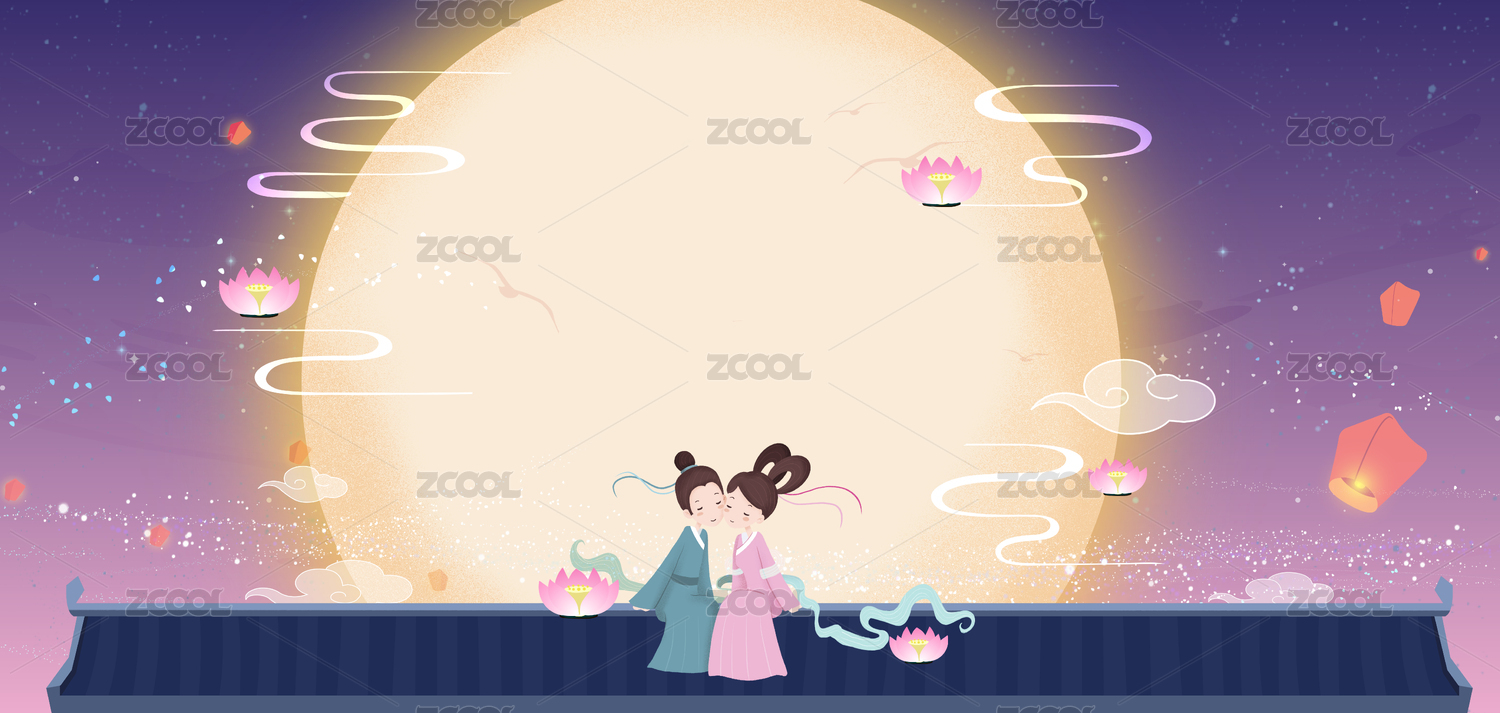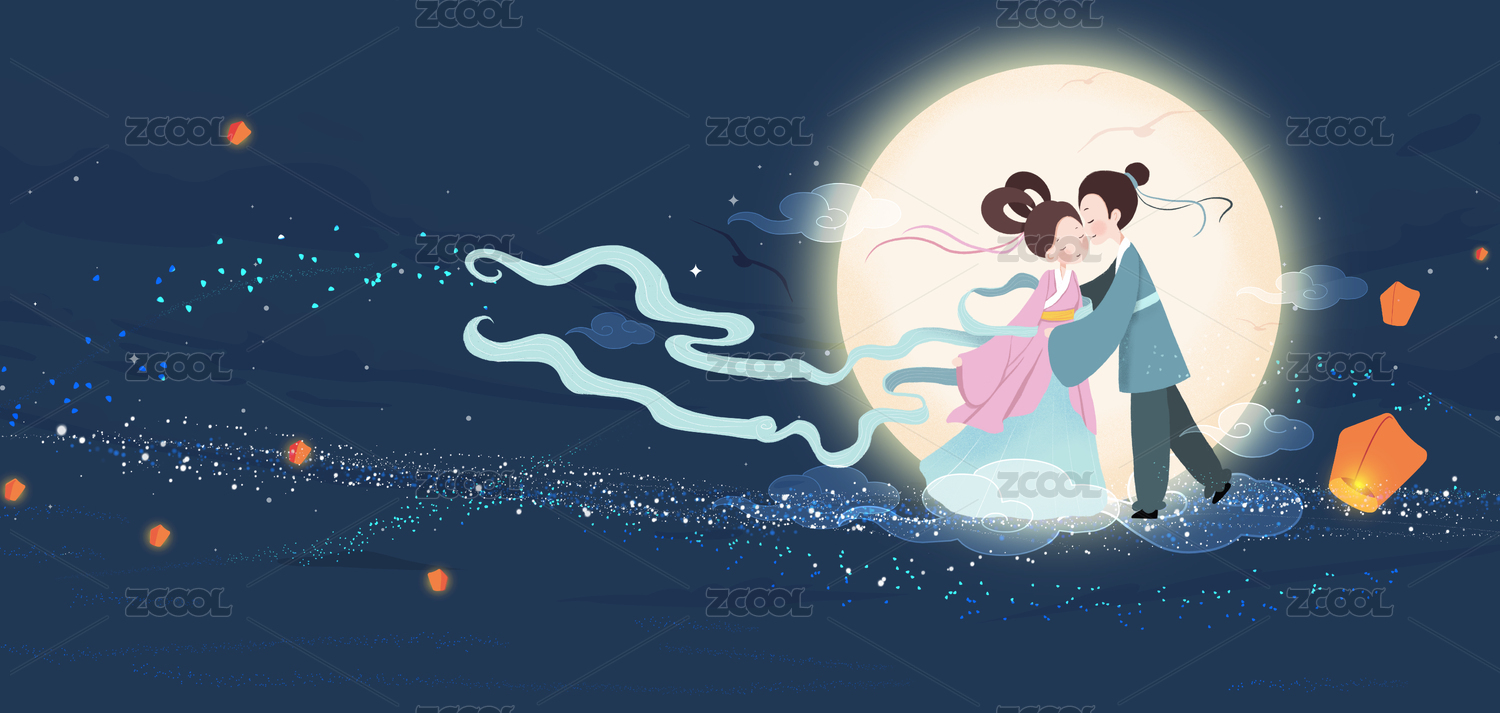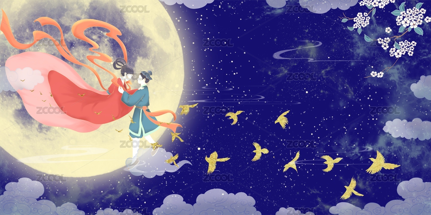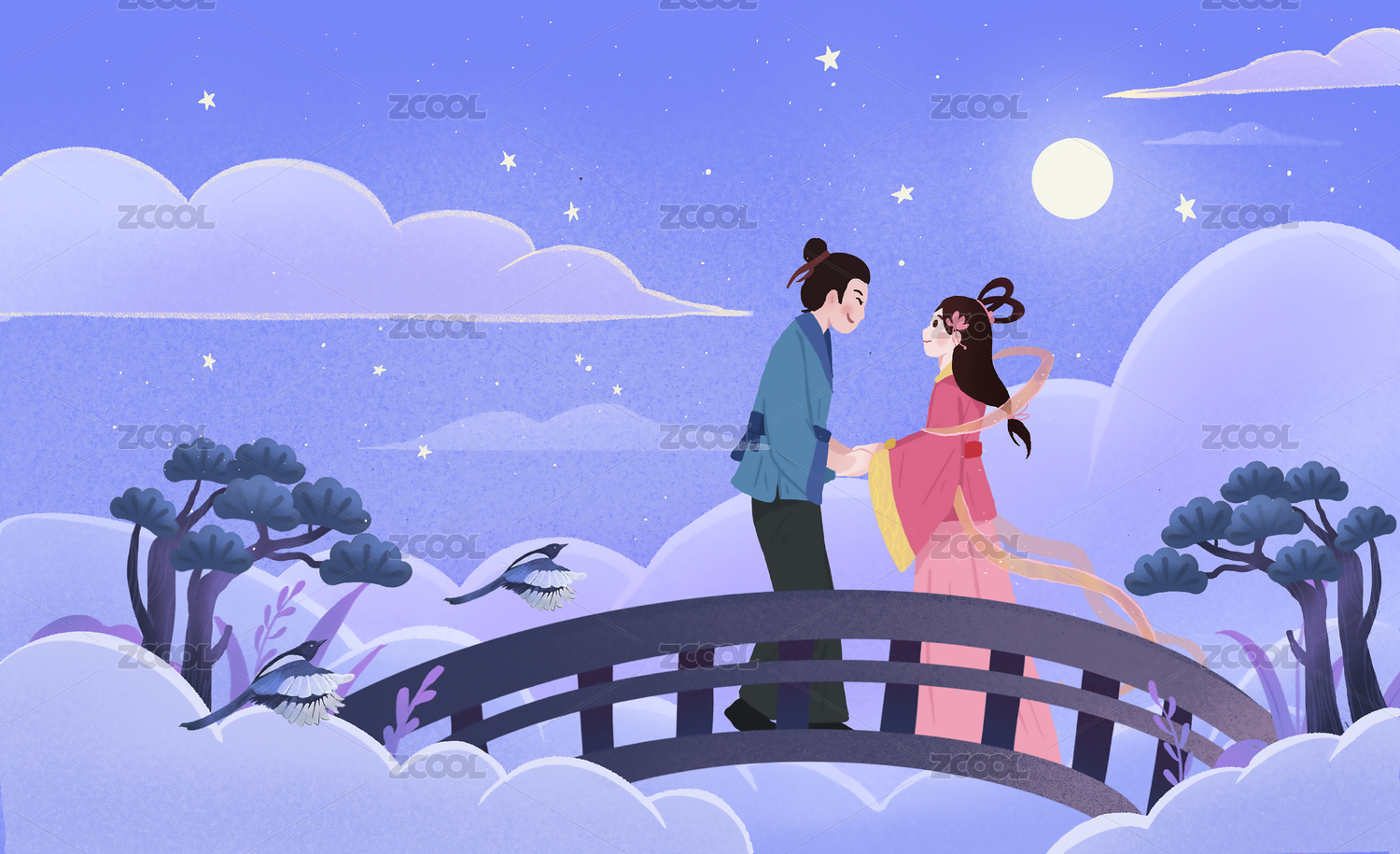 鹊桥上七夕时在圆月前相聚的牛郎织女
