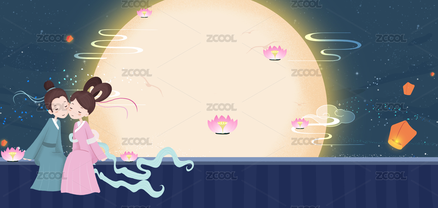 七夕牛郎织女相会国潮宽屏矢量插画海报