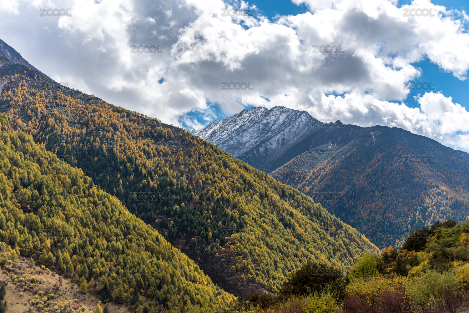 云南德钦蓝天白云衬托高山森林