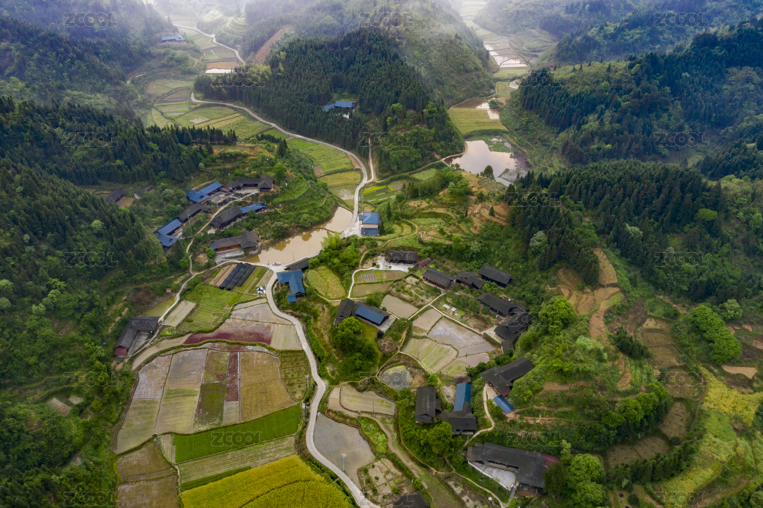 航拍湖南怀化烟雨朦胧的乡村