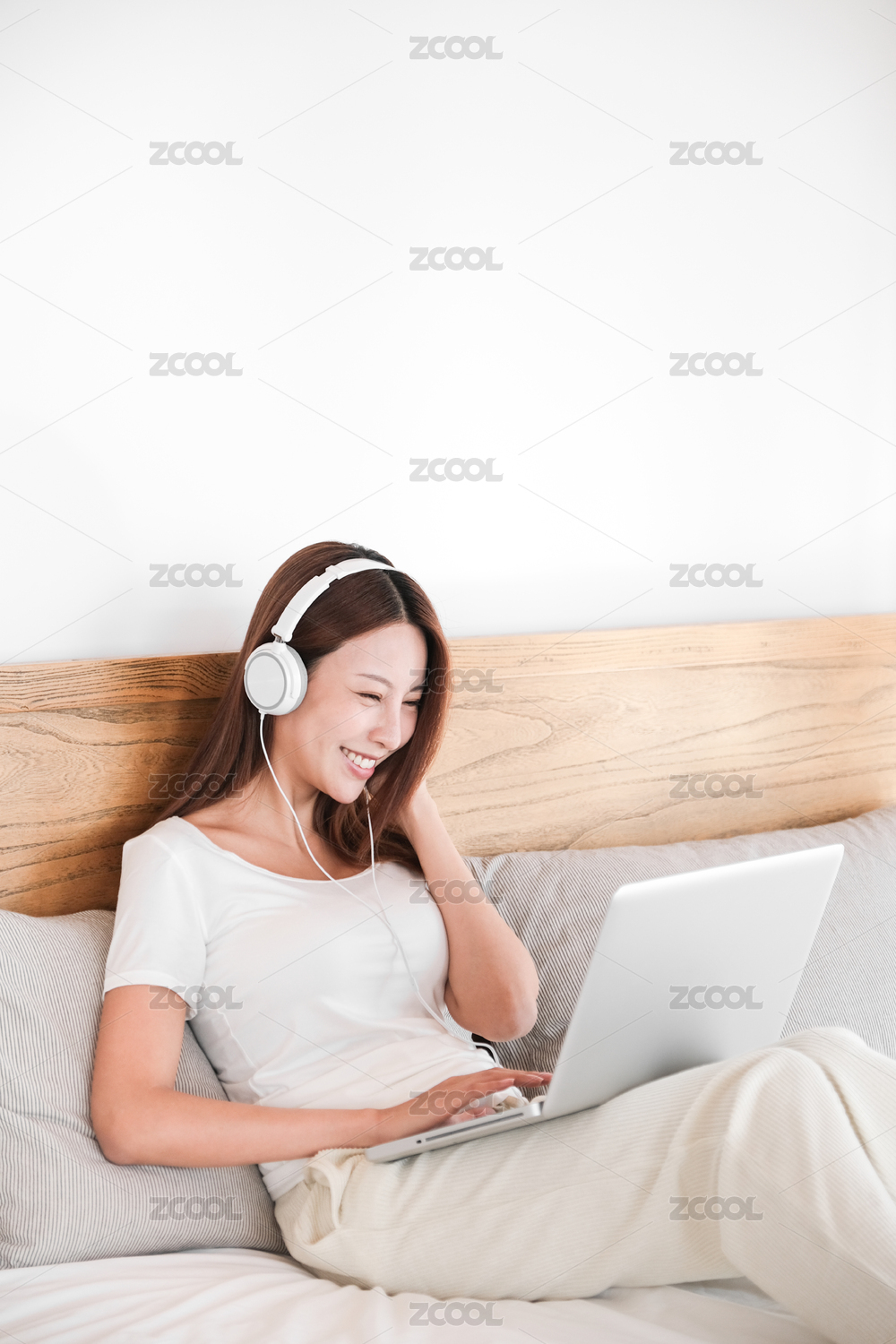 坐在床上一边使用电脑一边听音乐的中国女孩