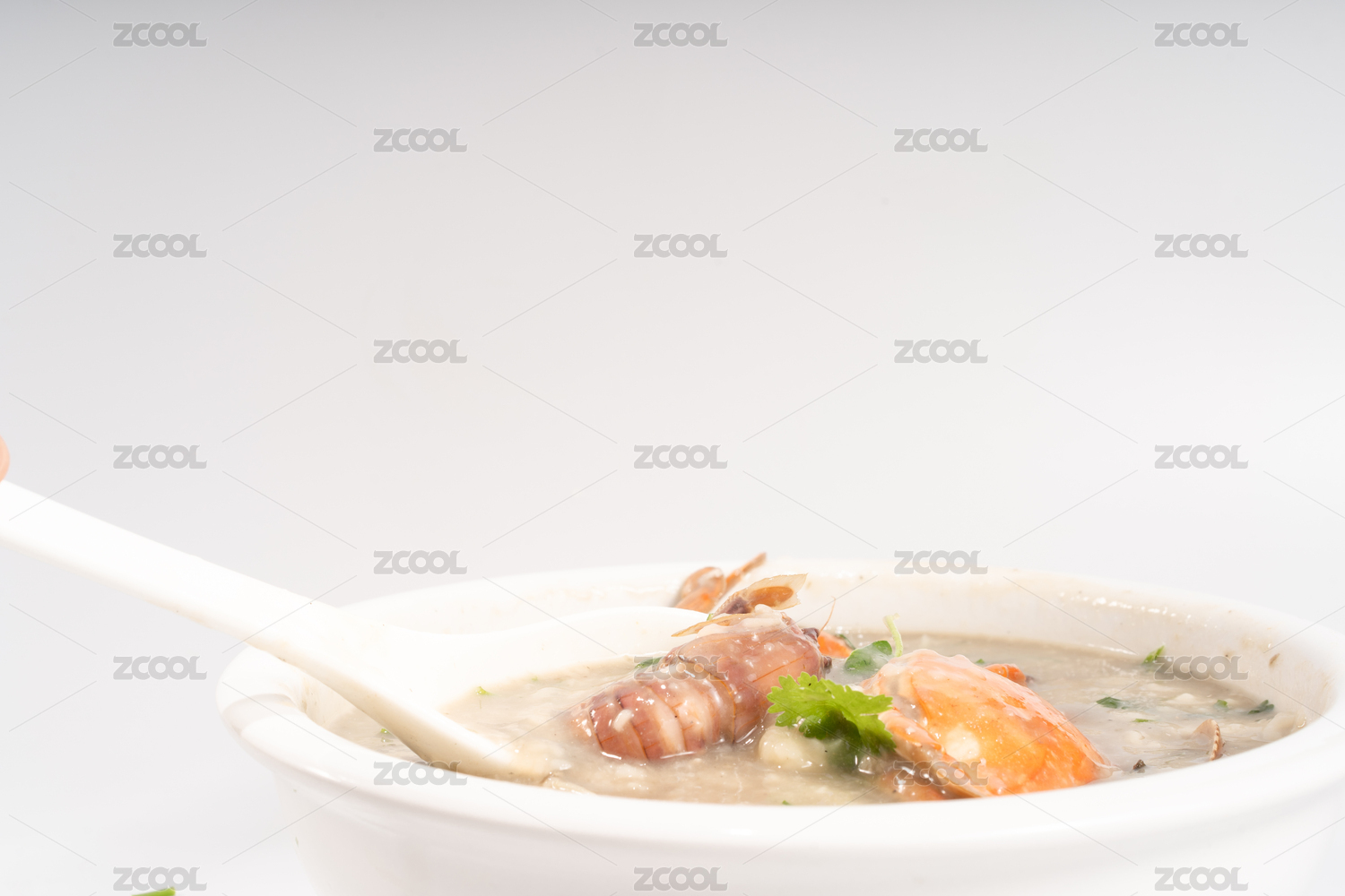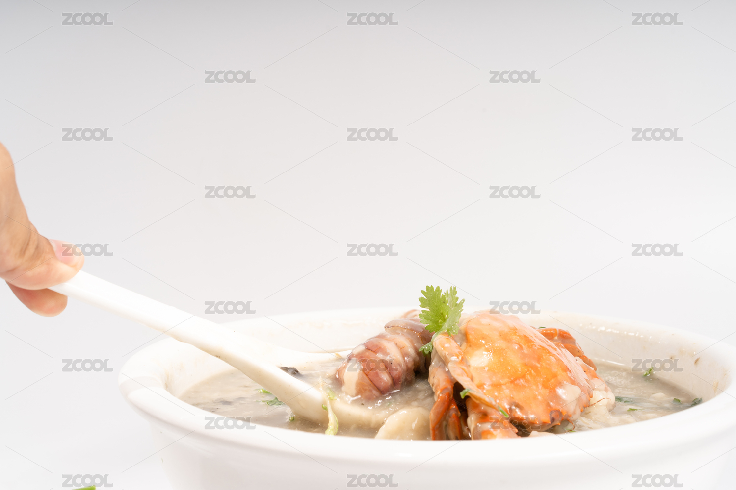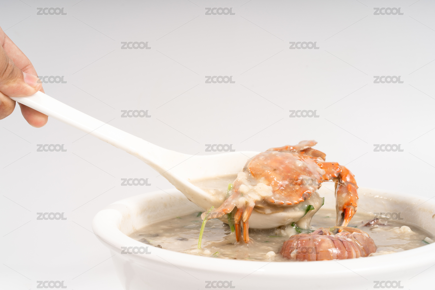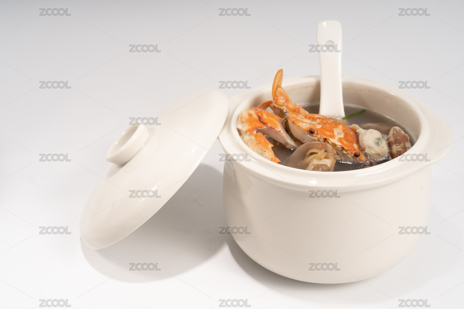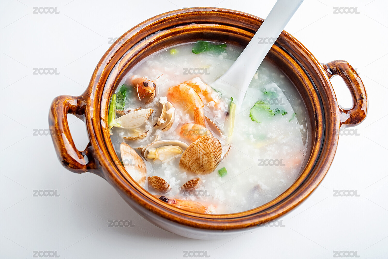 中国潮汕砂锅粥,厨房台面上一锅虾蟹海鲜粥