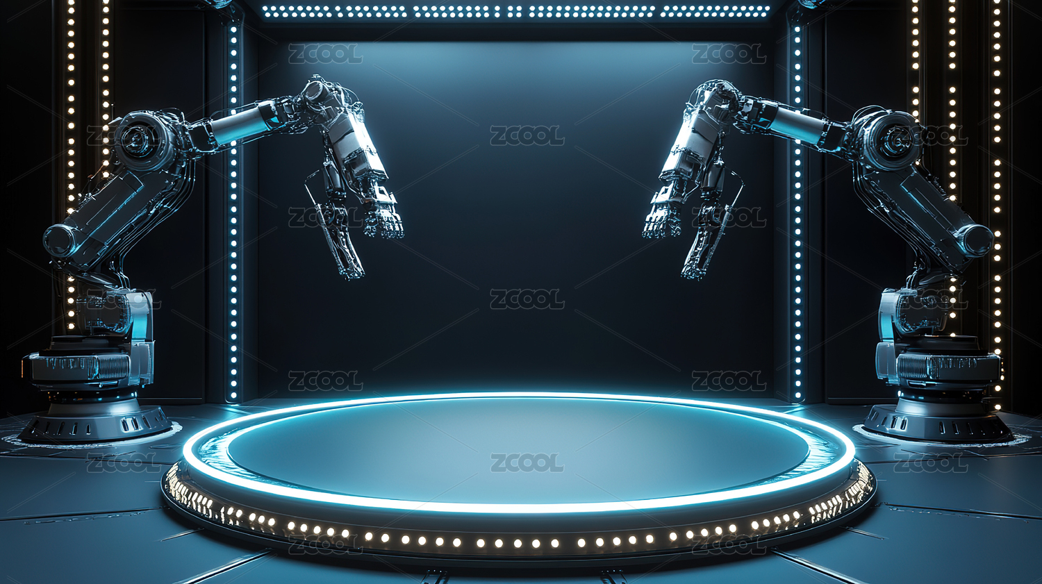 产品展台,机械臂,科技,圆形,发光,蓝色,暗色,背景,展台,舞台