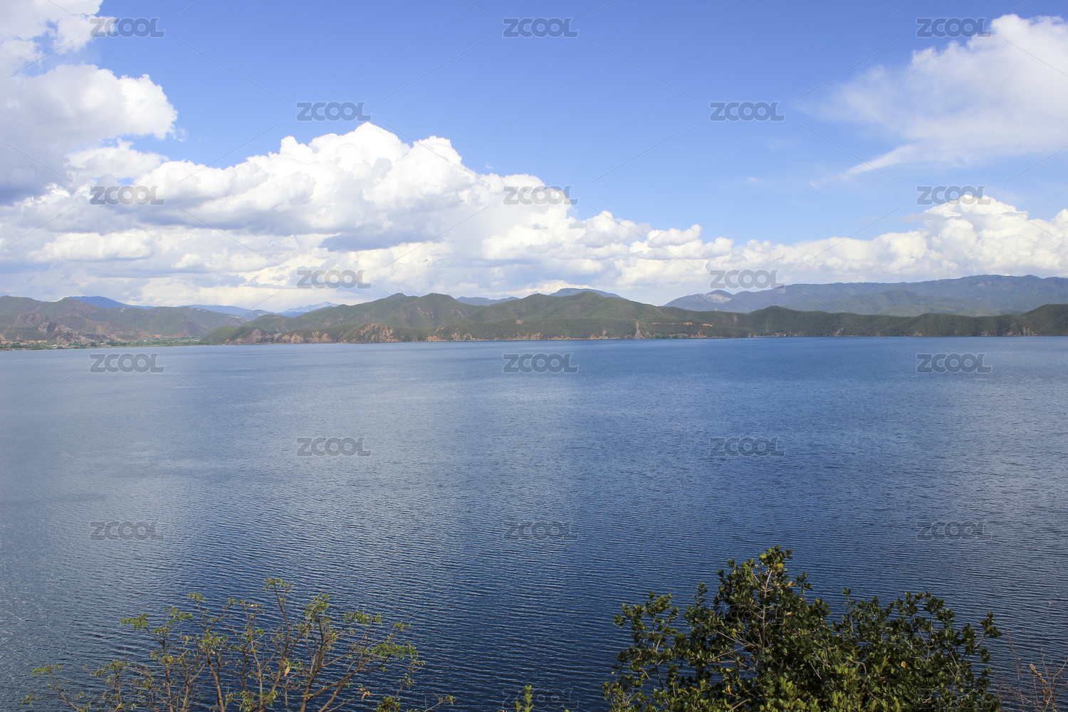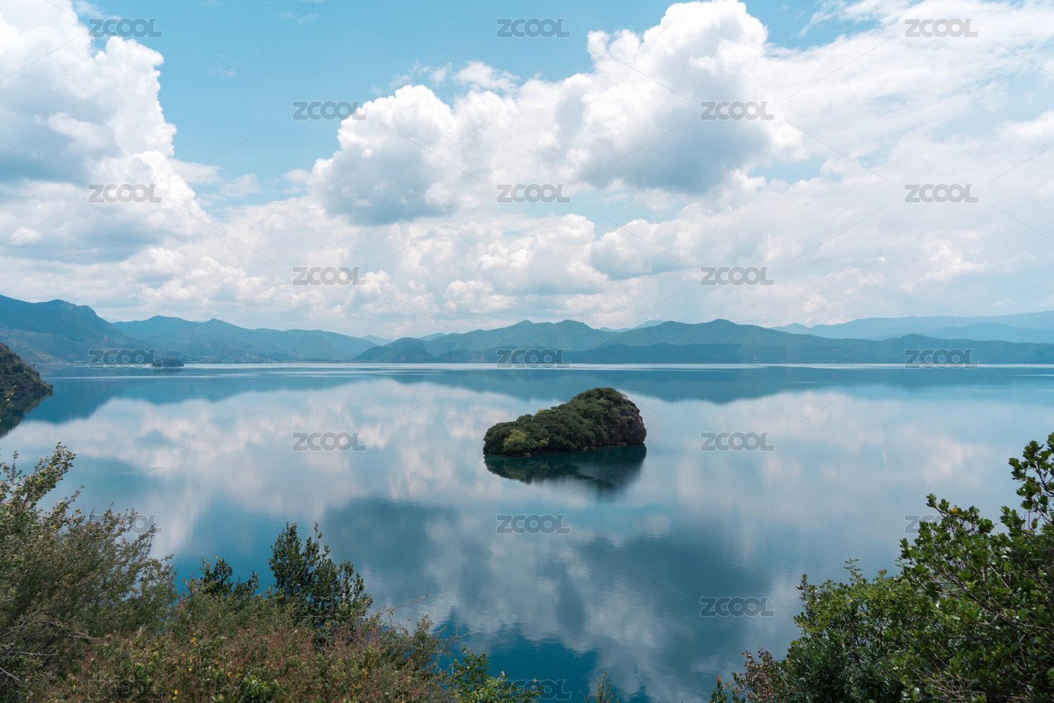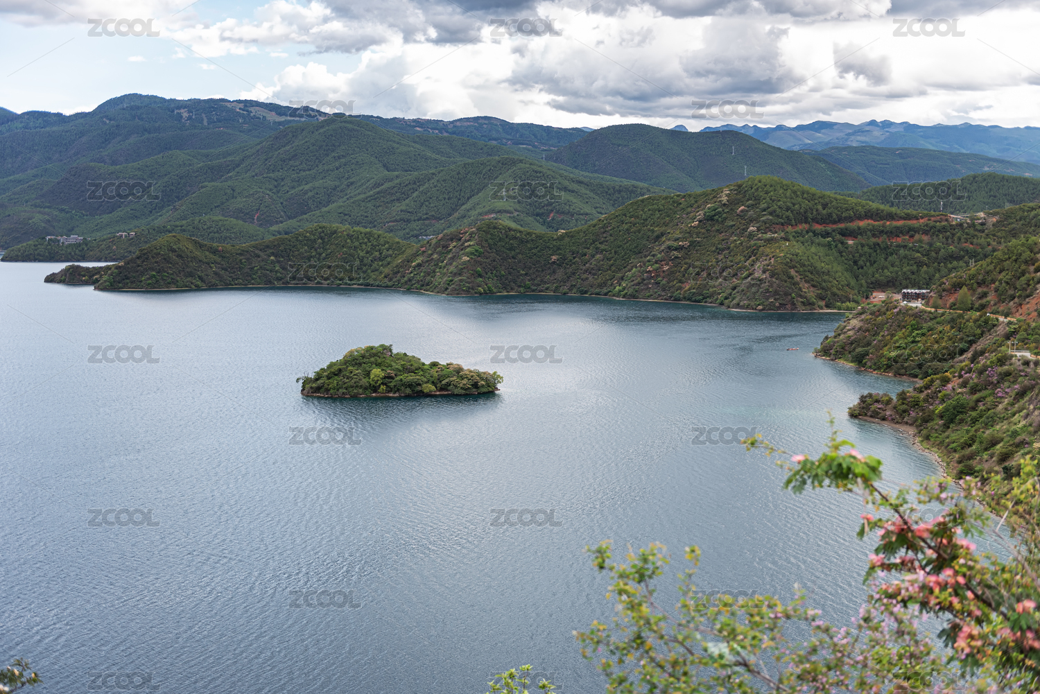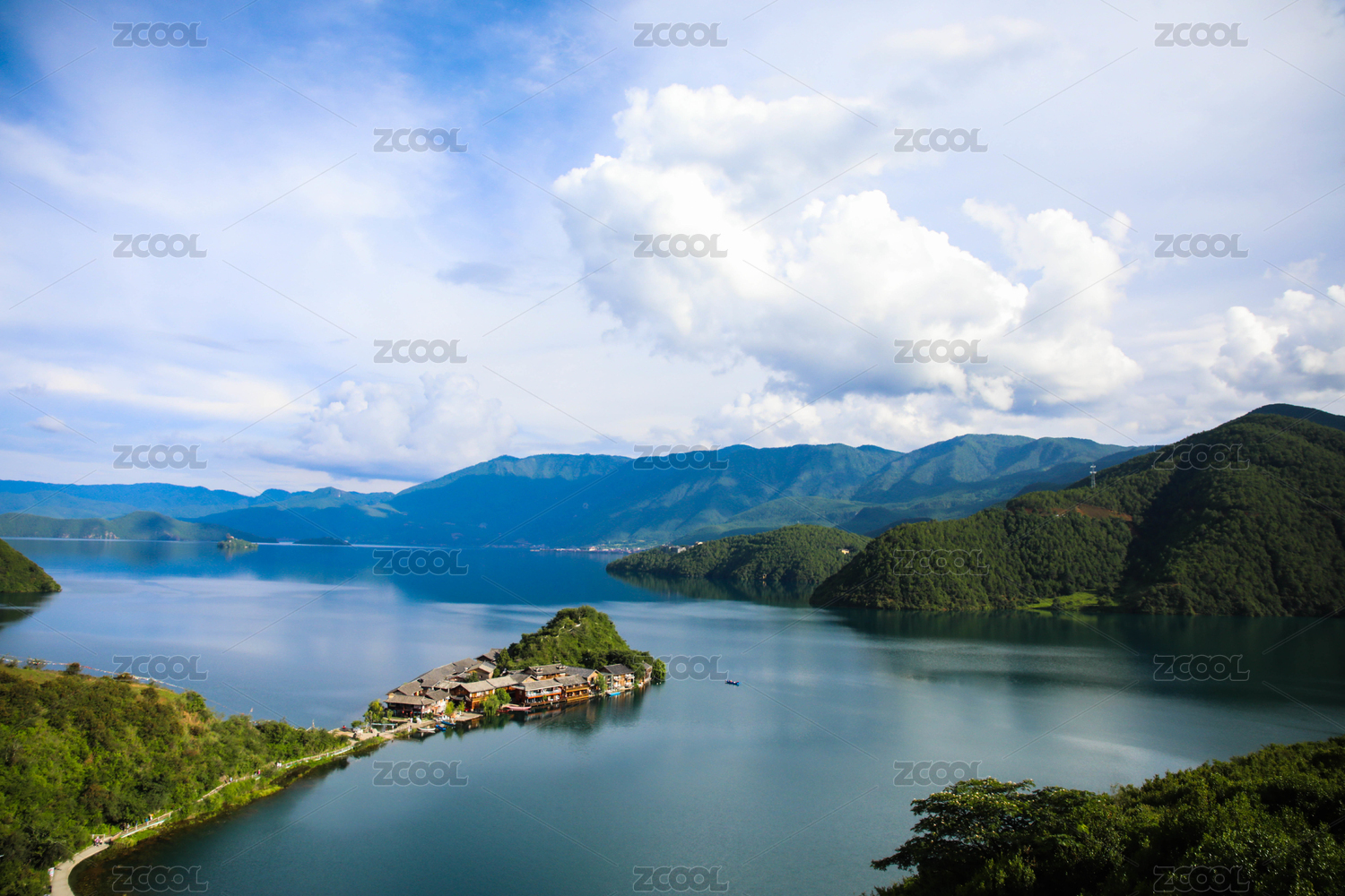 云南宁蒗县泸沽湖景区船只湖面岛屿蓝天白云