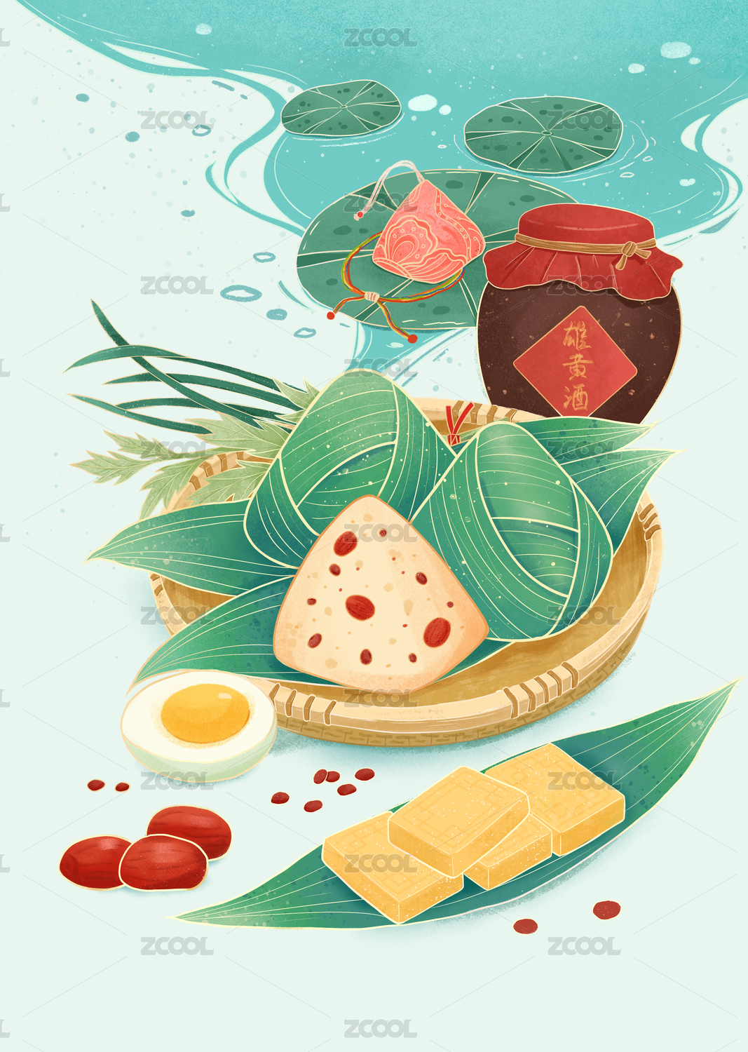 窗户里桌子上摆放的端午粽子和酒矢量插图