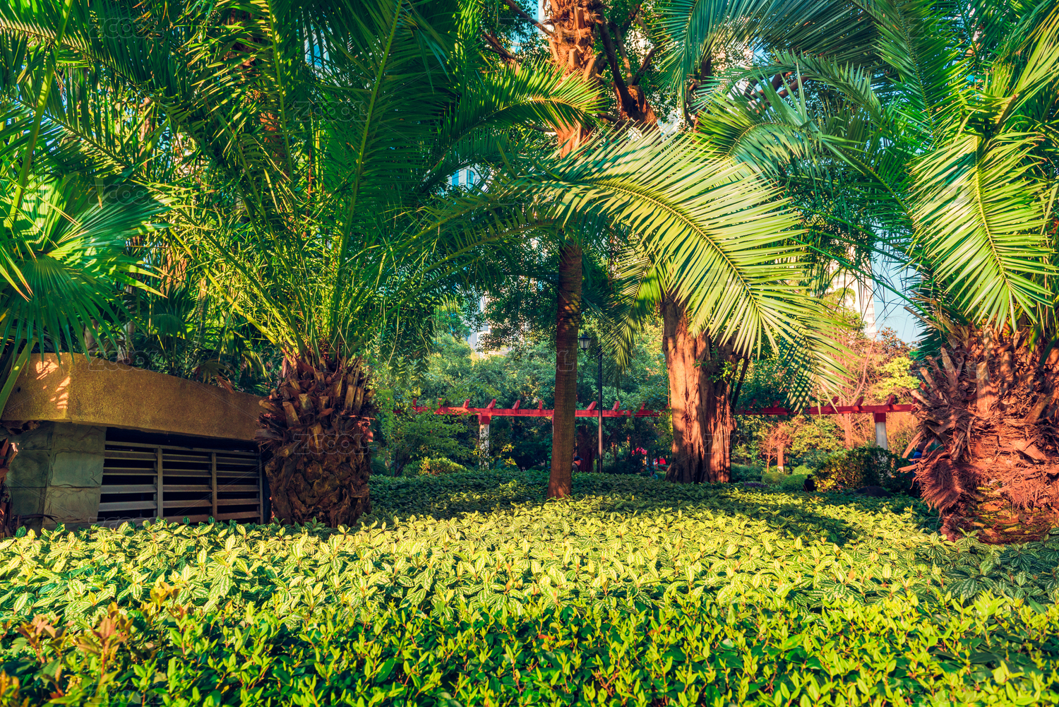 中国海南公园绿草地上的热带植物
