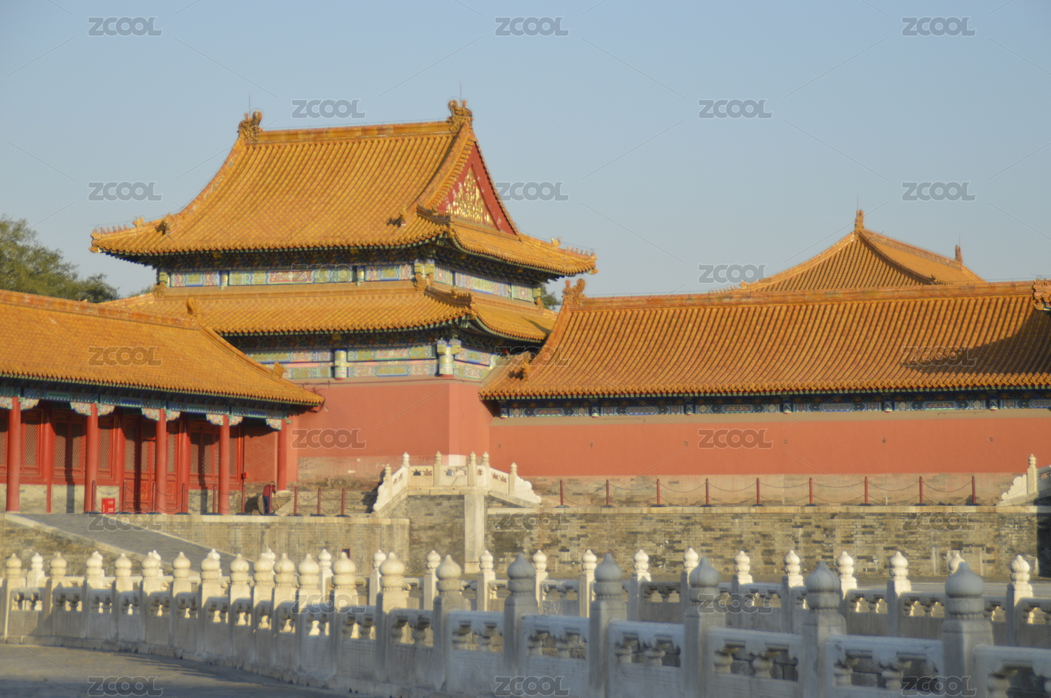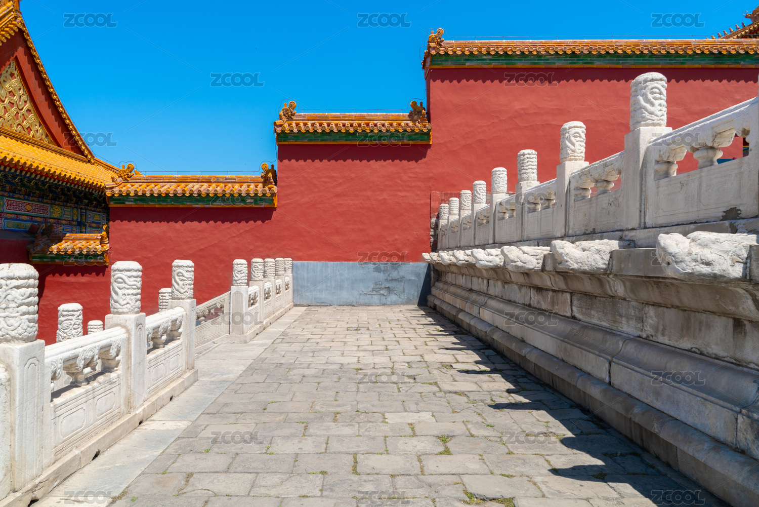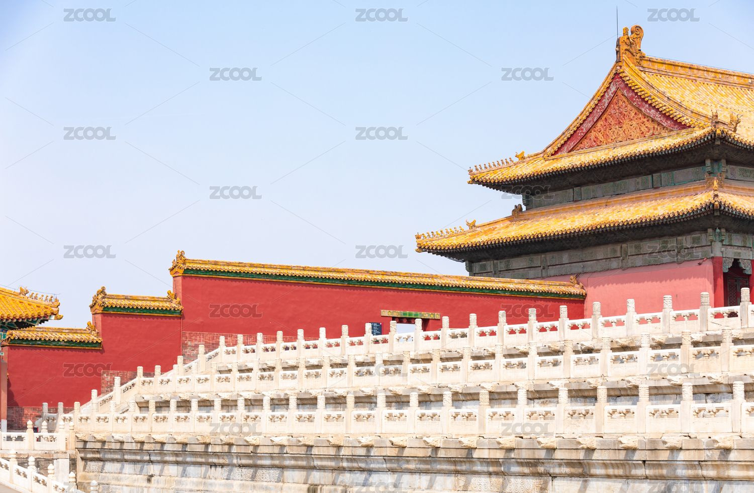 阳光下北京故宫古建筑屋檐与红墙局部特写