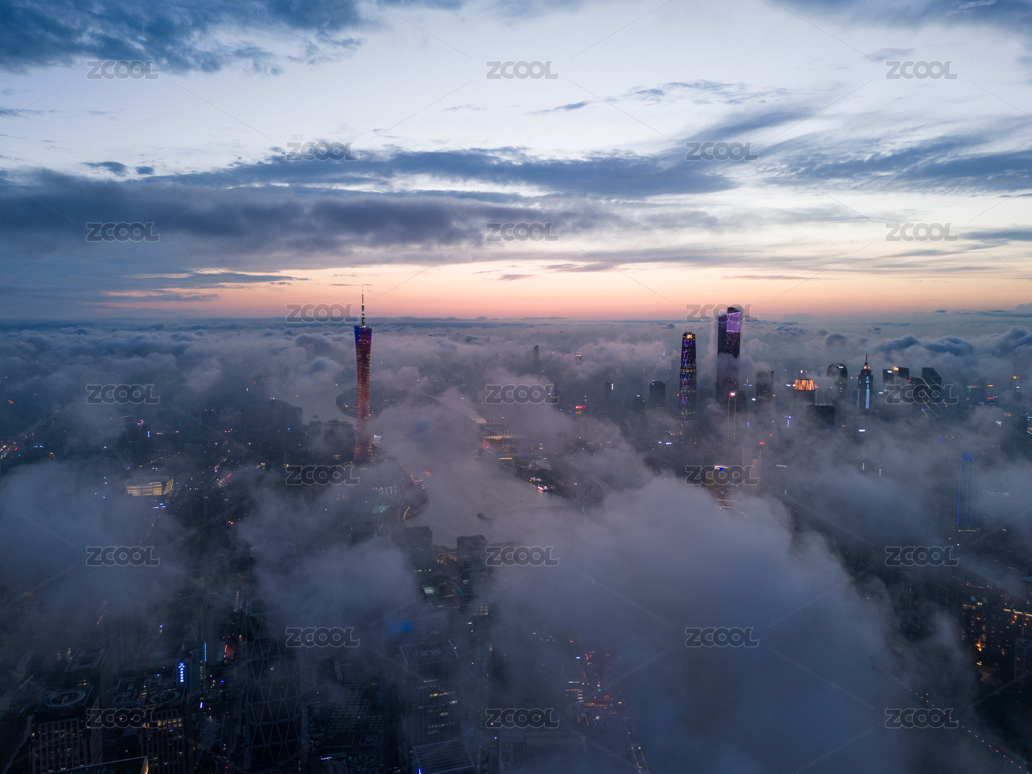 广州珠江岸城市高楼与云雾缭绕风光航拍