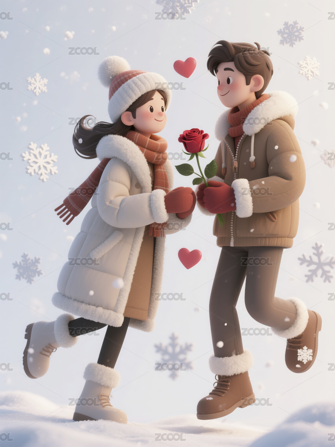 冬季卡通情侣雪地行走