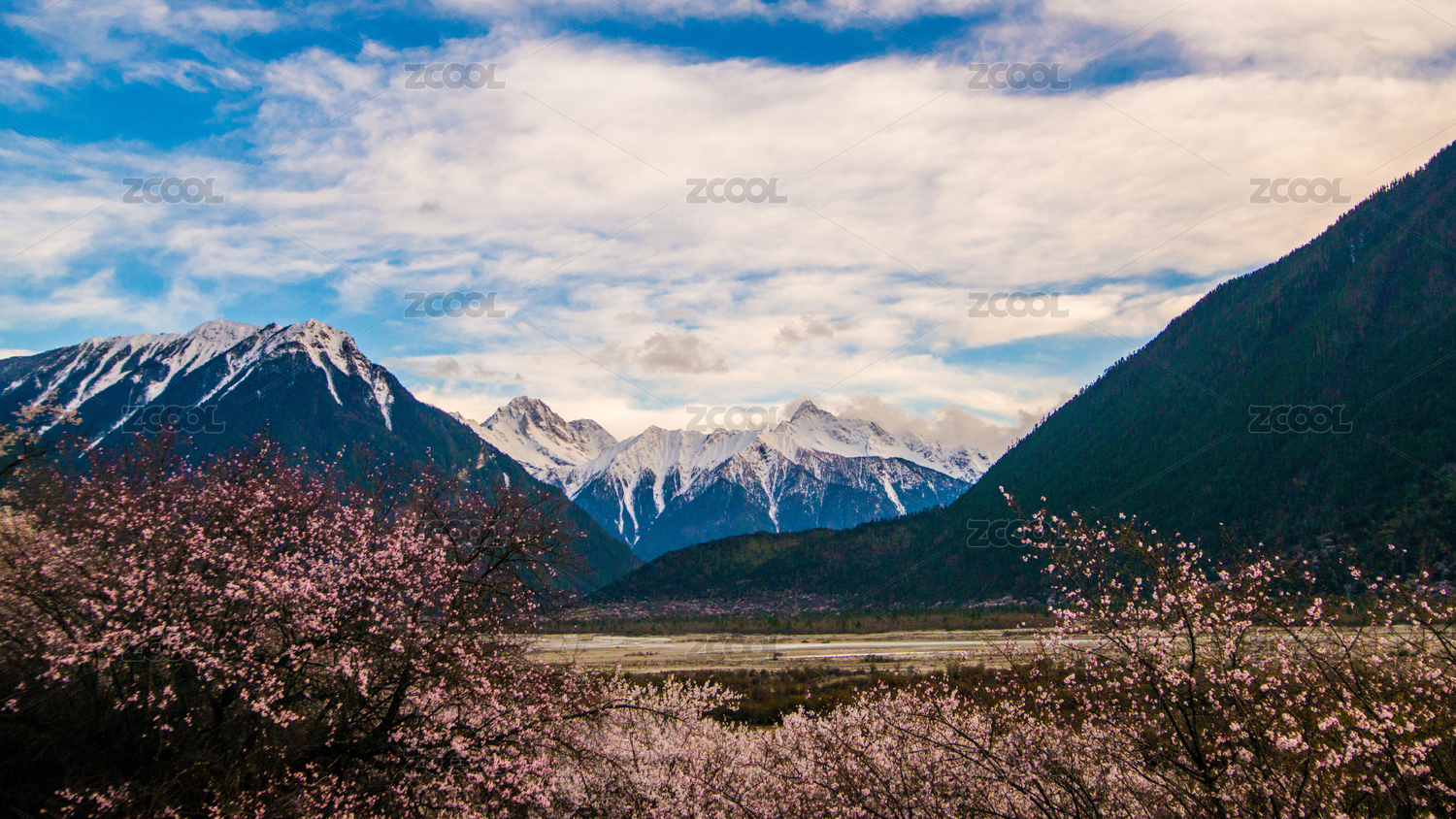 西藏林芝,南迦巴瓦峰,春天,雪山,桃花,蓝天,白云,著名景点