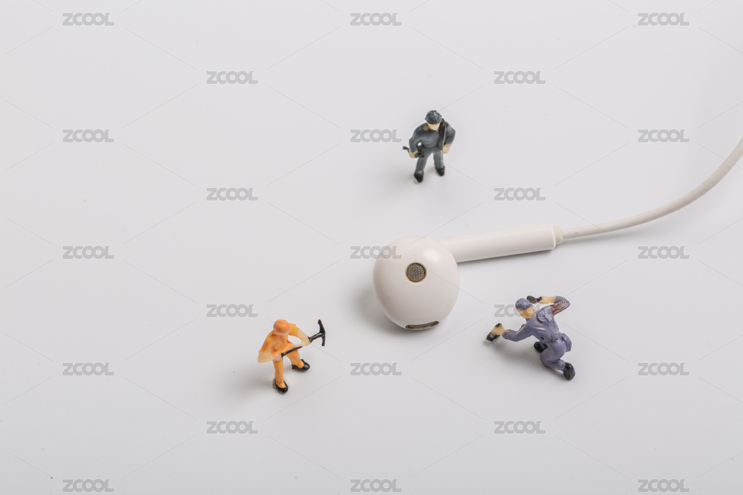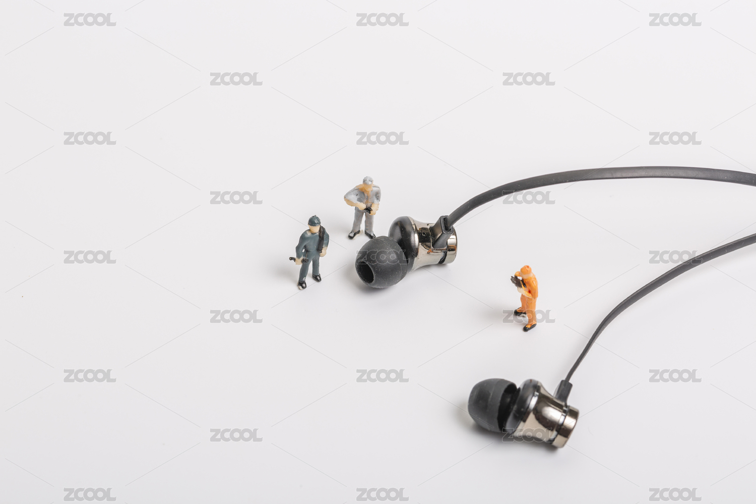 白色背景上的耳机和微缩工人