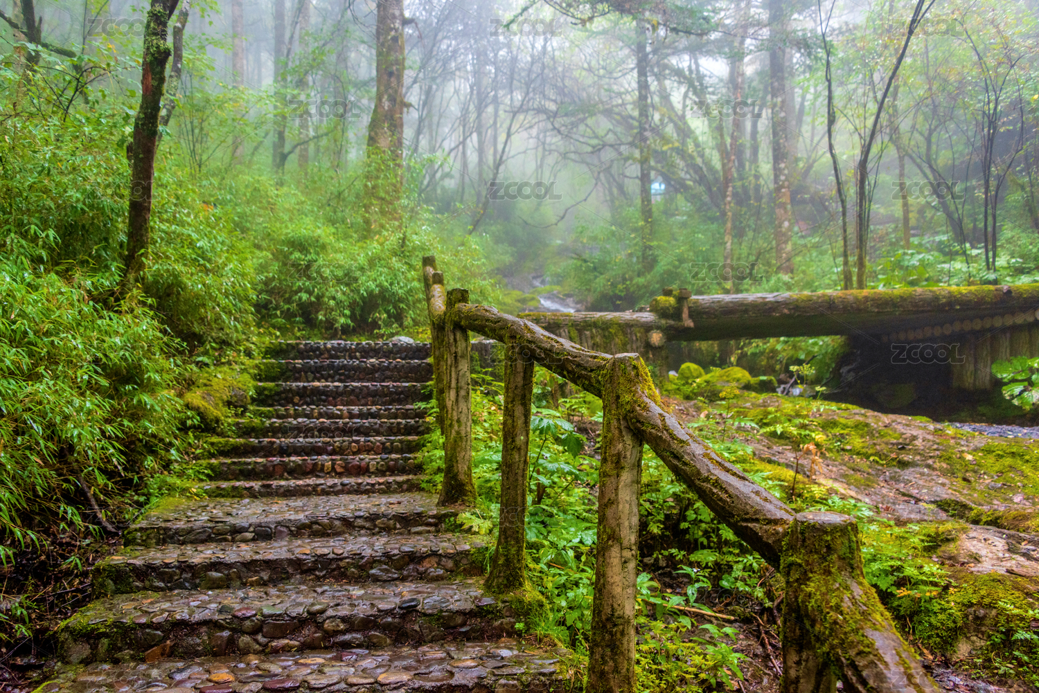秋季大雾中的雅安龙苍沟栈道和溪流