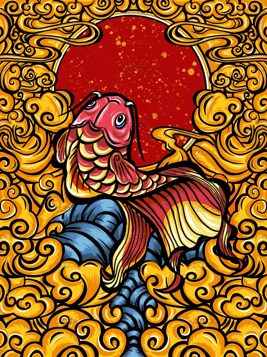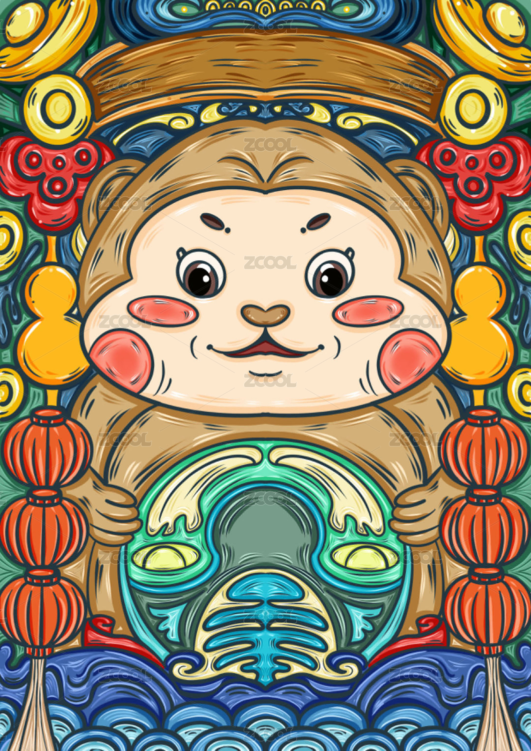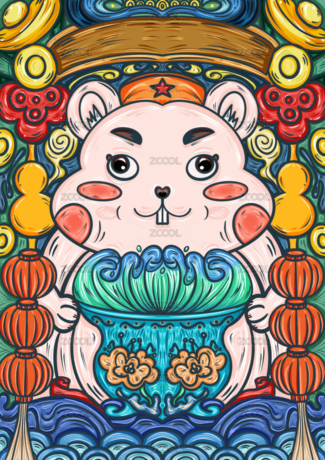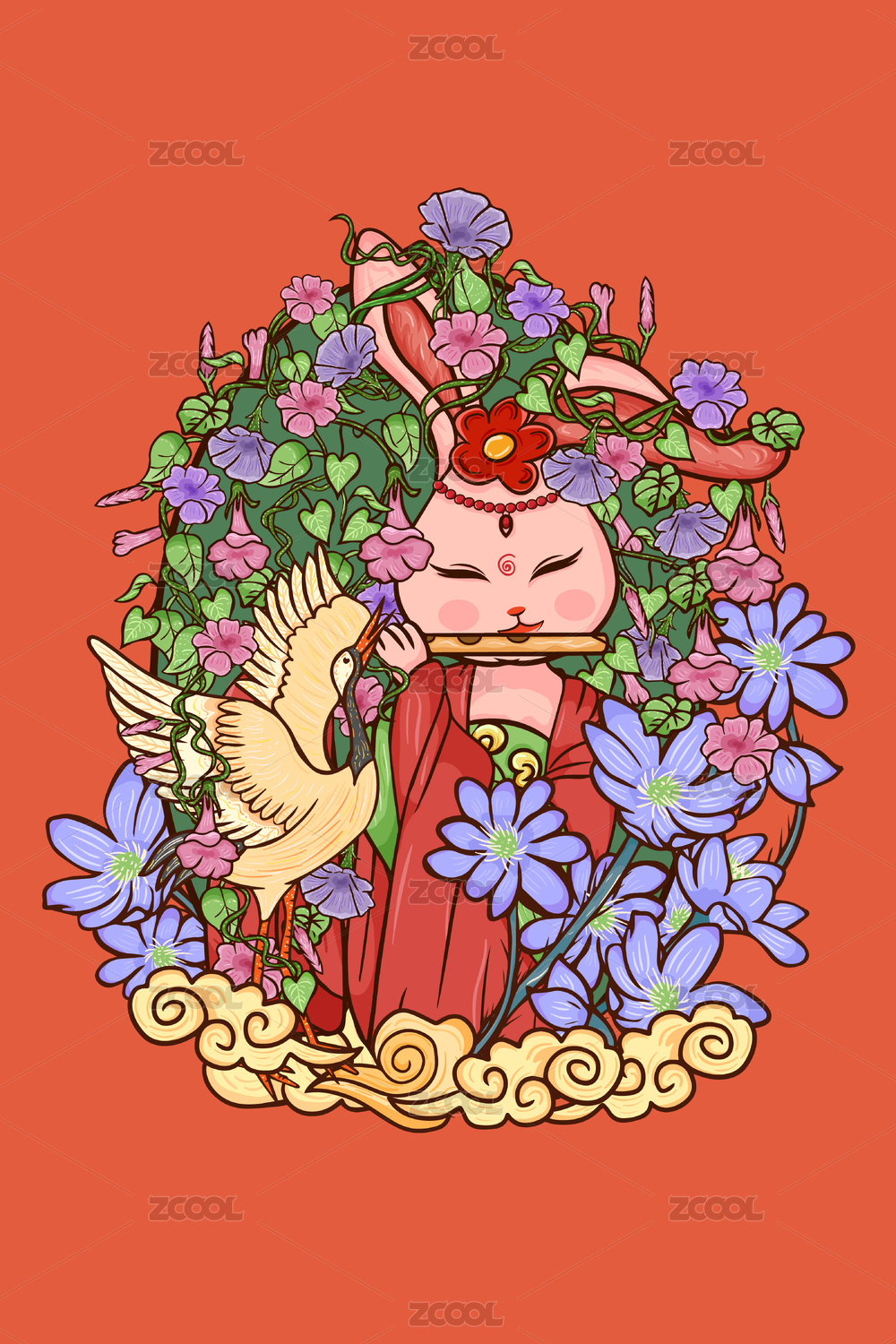 国潮花朵仙鹤和拟人兔子吹笛子矢量插画