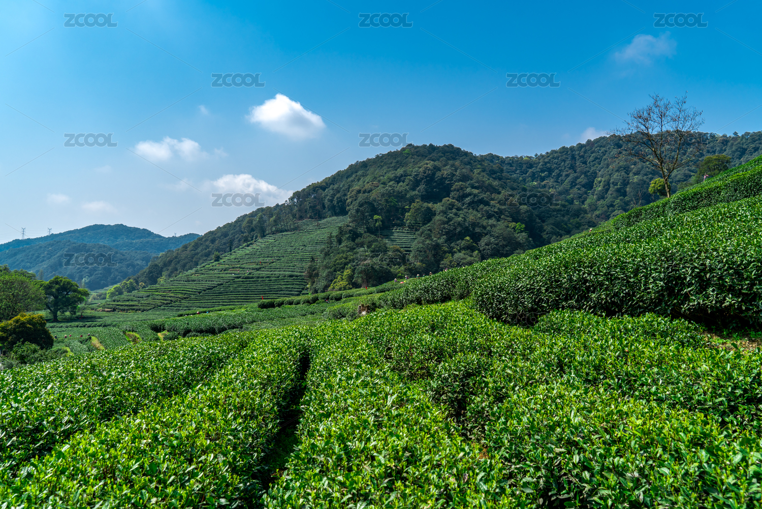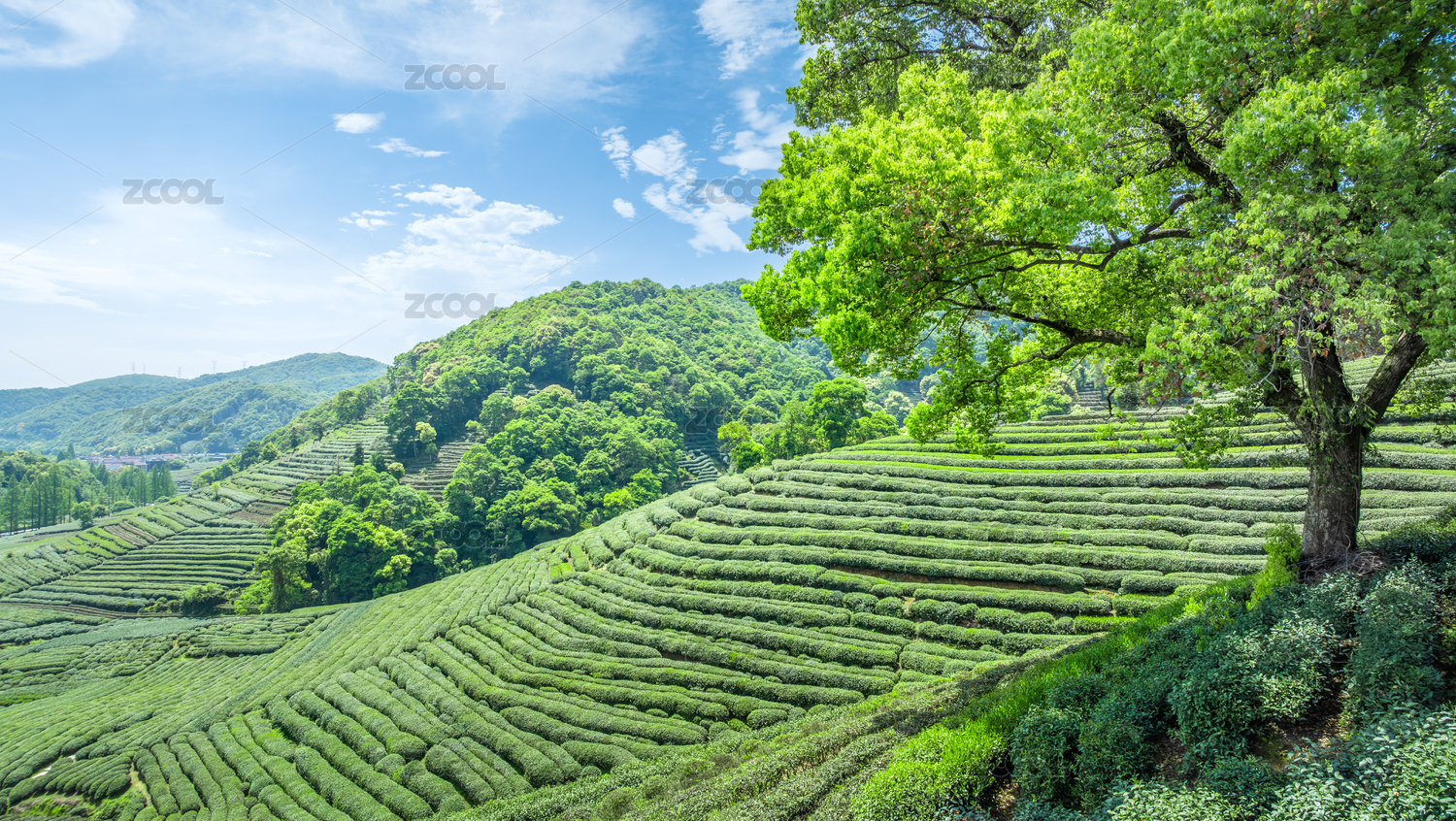 中国山区蓝天白云下郁郁葱葱的茶园