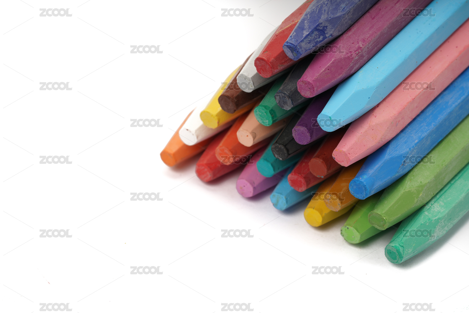 白色背景下一堆彩色的油画棒特写