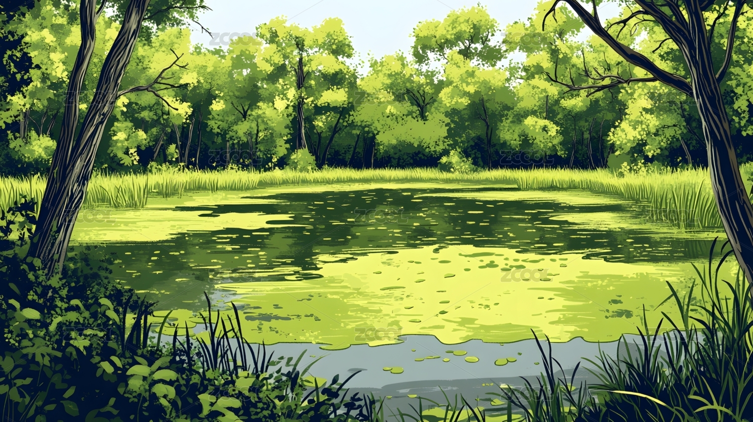 夏天茂盛的森林里盛开荷花的池塘插画
