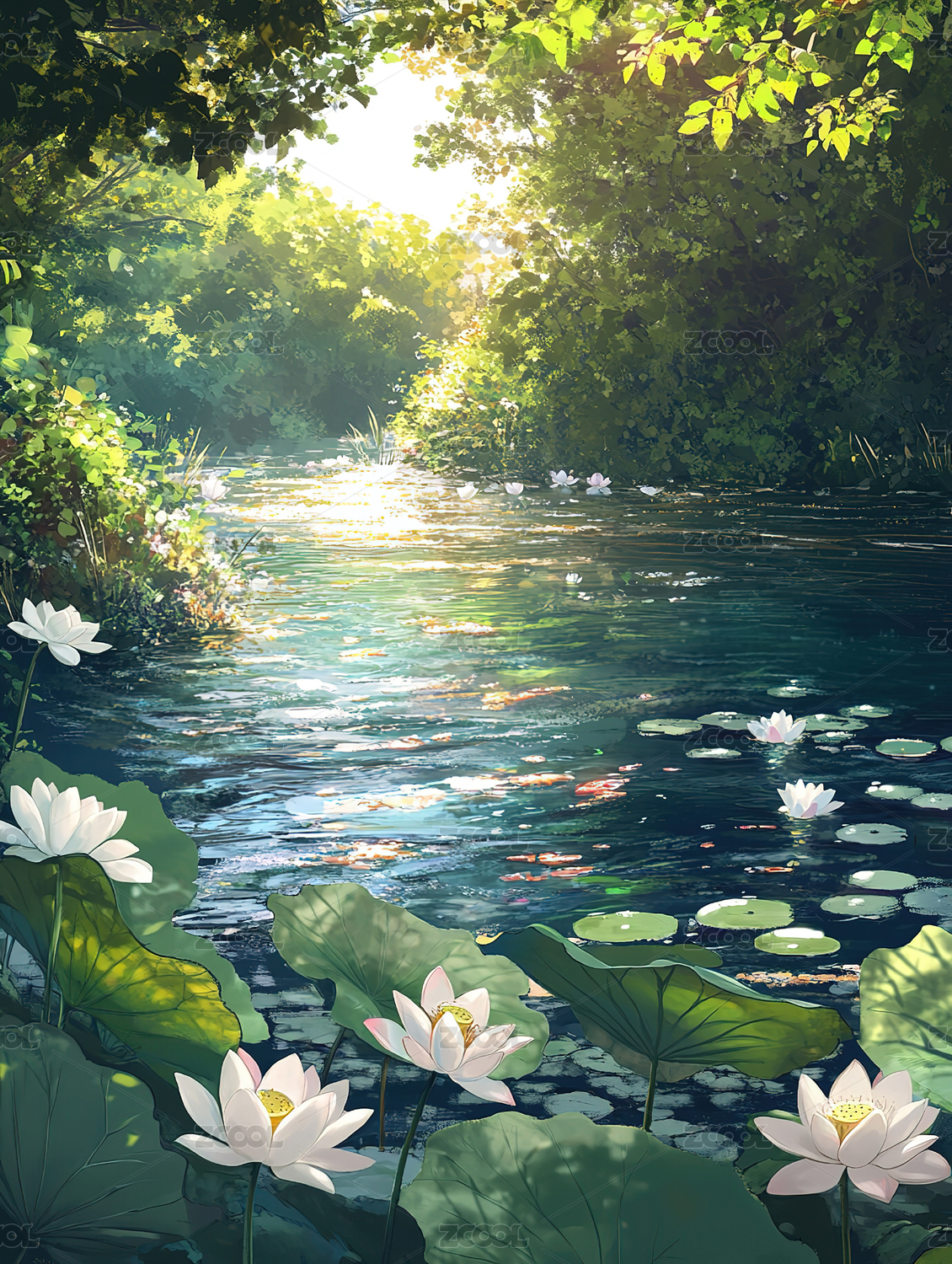 阳光下的睡莲与绿树