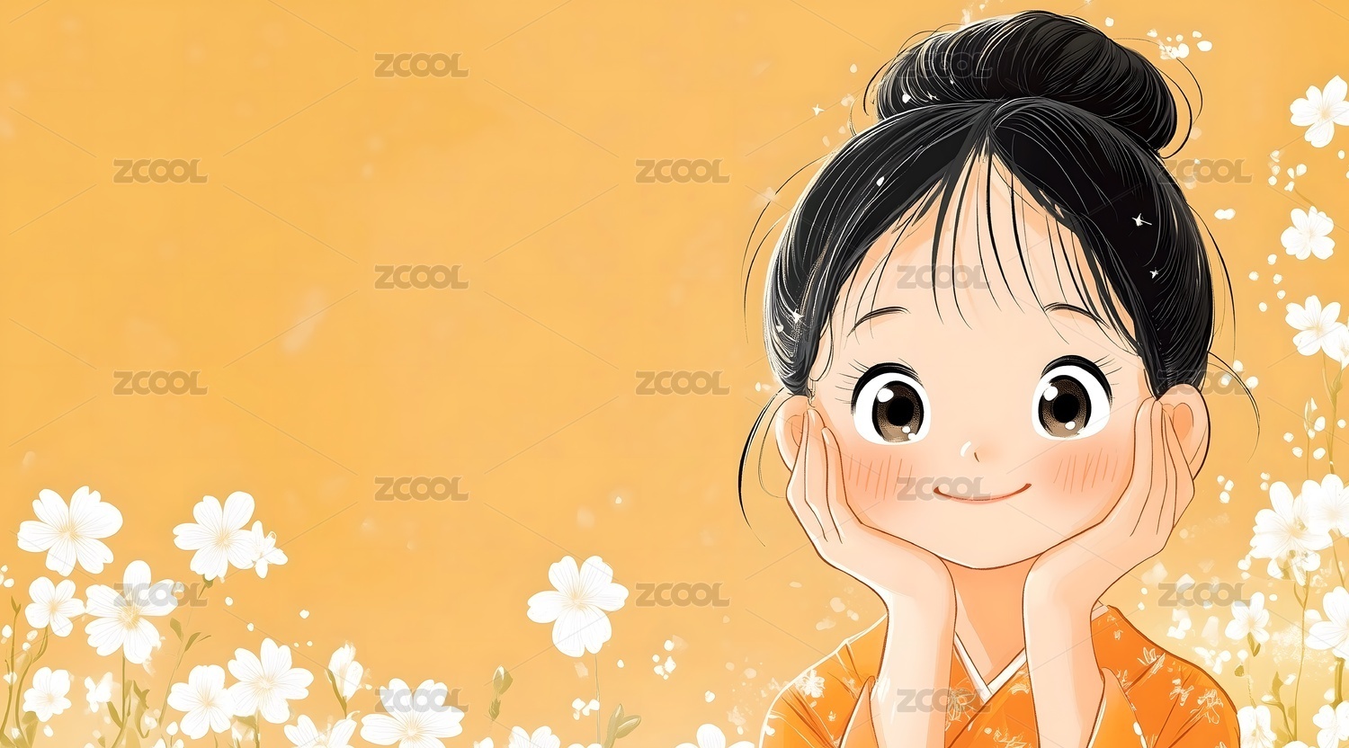手托脸颊的橙色发饰女孩