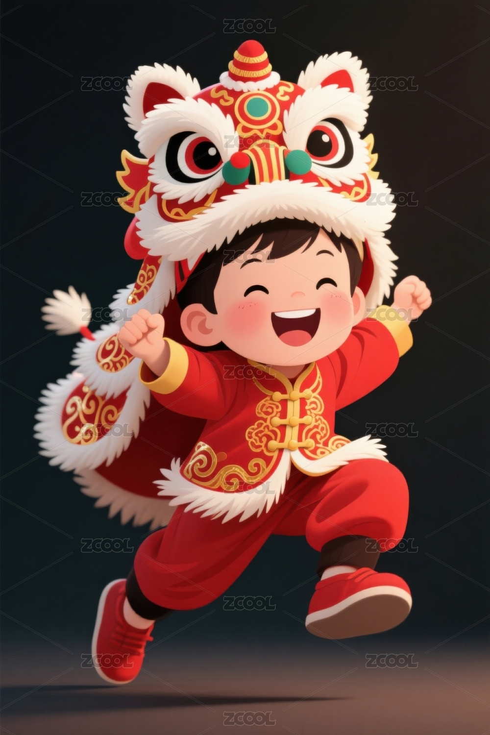 中国风,节日,舞狮,醒狮,春节,人,孩子,儿童,卡通,插画