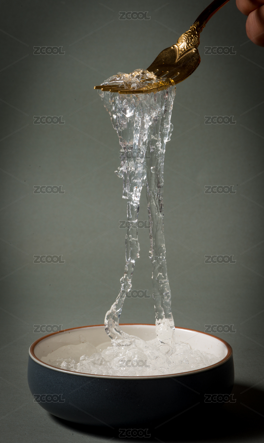 金色叉子捞出透明玻璃杯中的燕窝