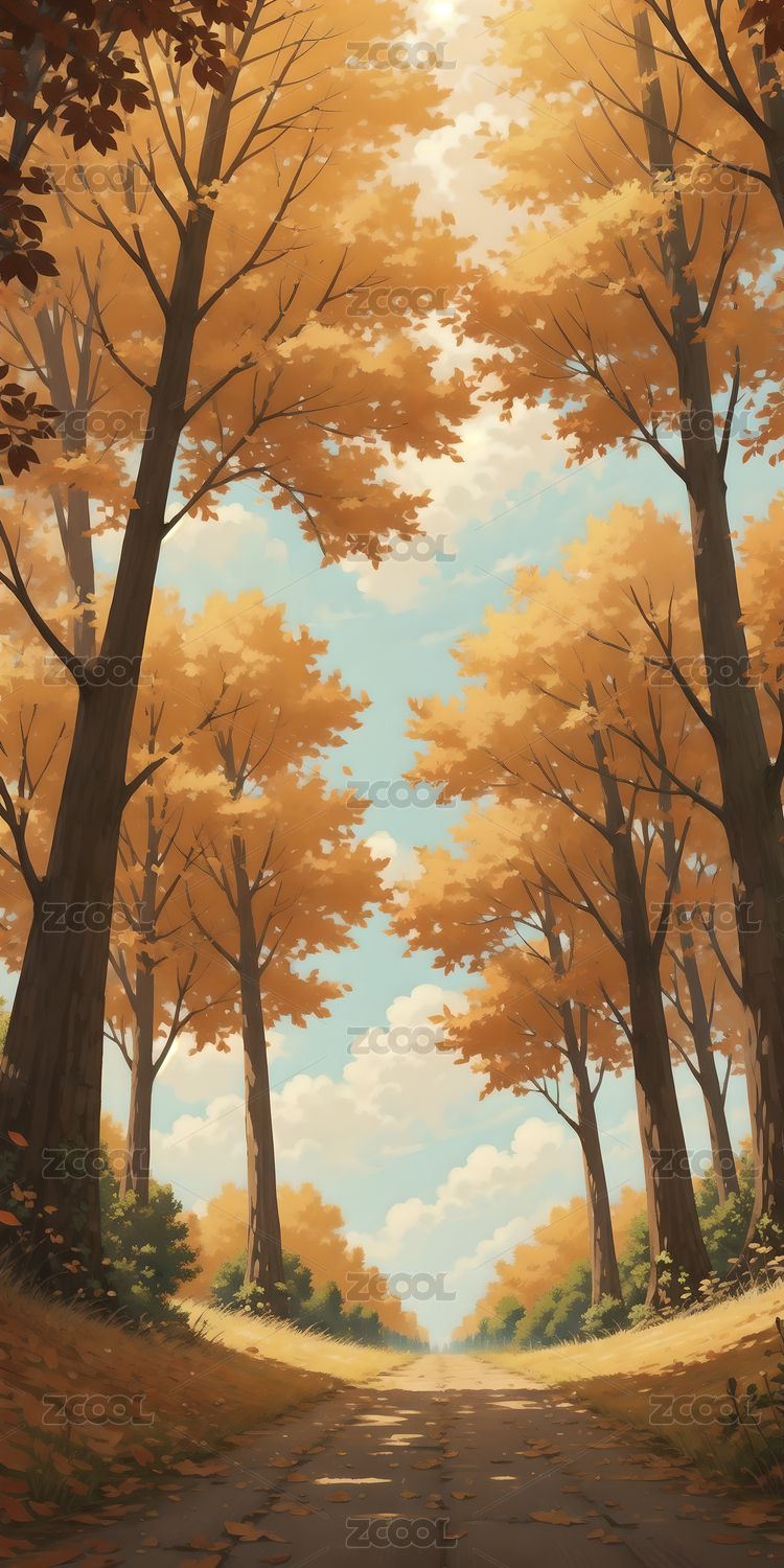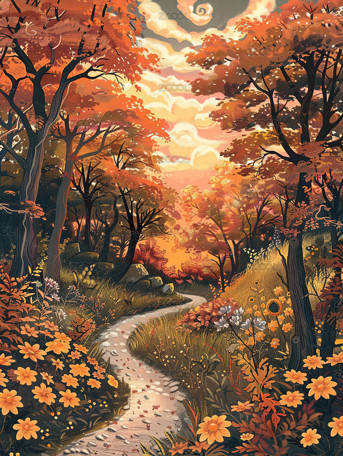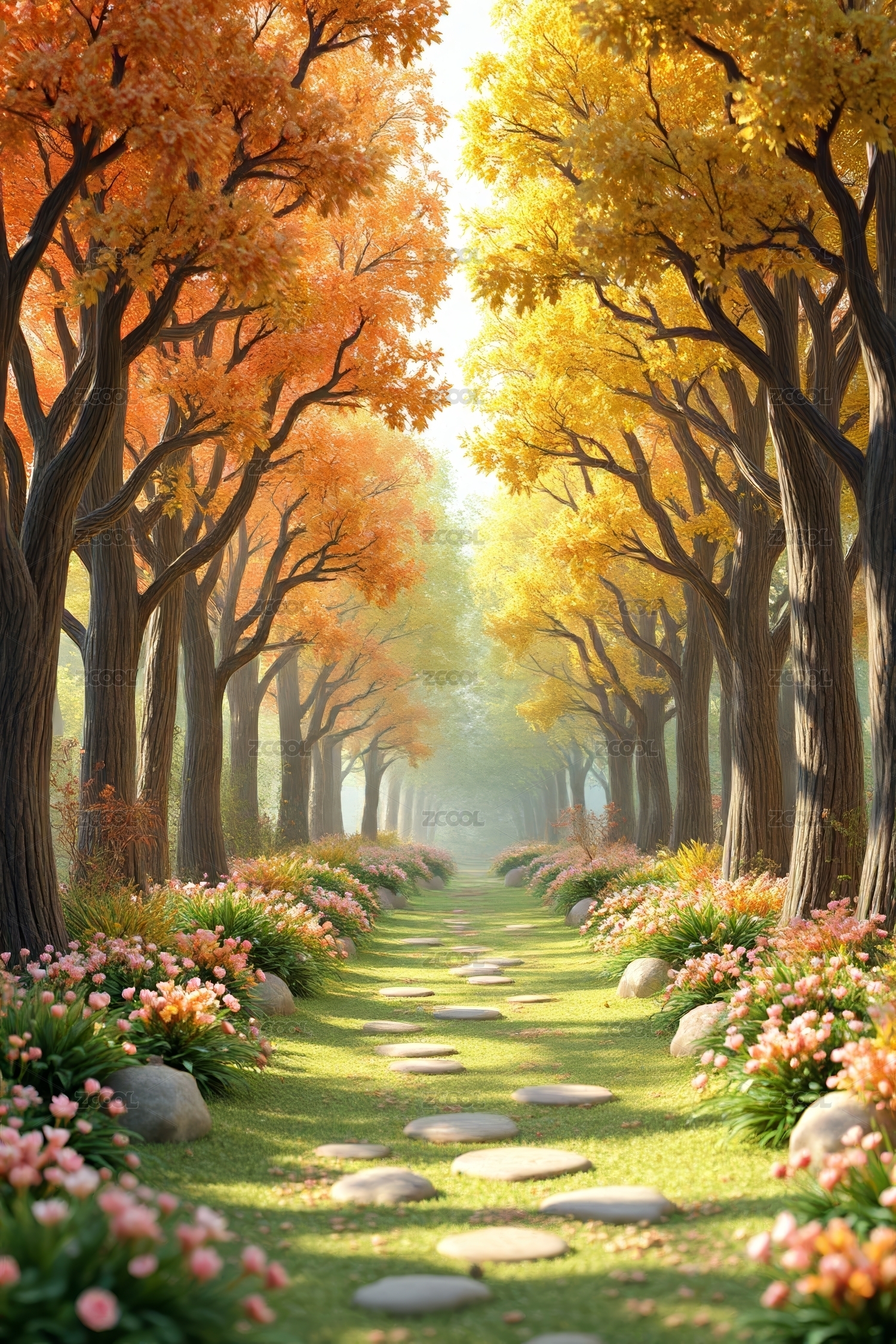 秋日童话般的林间小路 金色秋季的梦幻花园