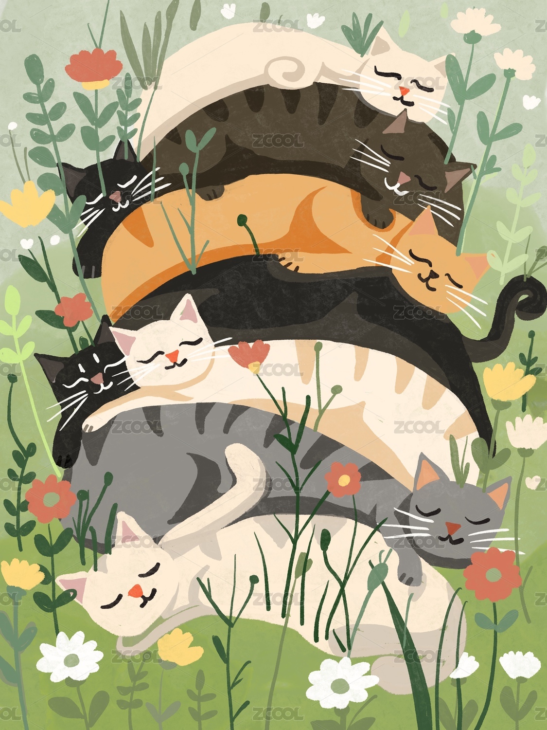 儿童手绘插画可爱温馨猫妈妈和她的孩子