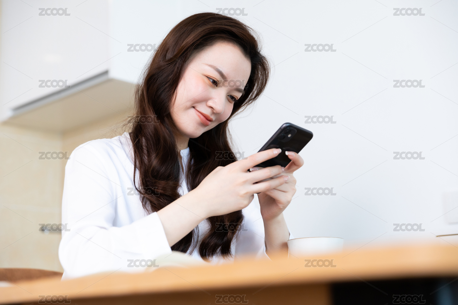 咖啡馆内坐在窗边使用智能手机的亚裔女人面带微笑