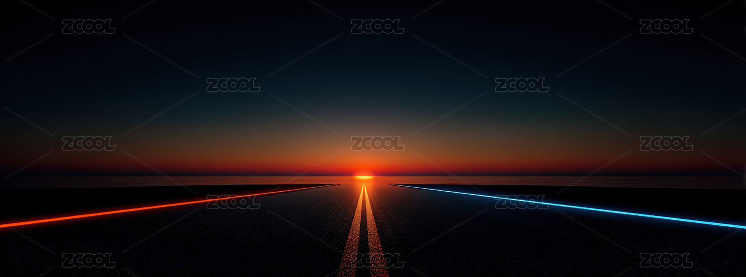 道路,白色,路边线,白色虚线,天空,深蓝色,橙色,渐变,地平线,太阳
