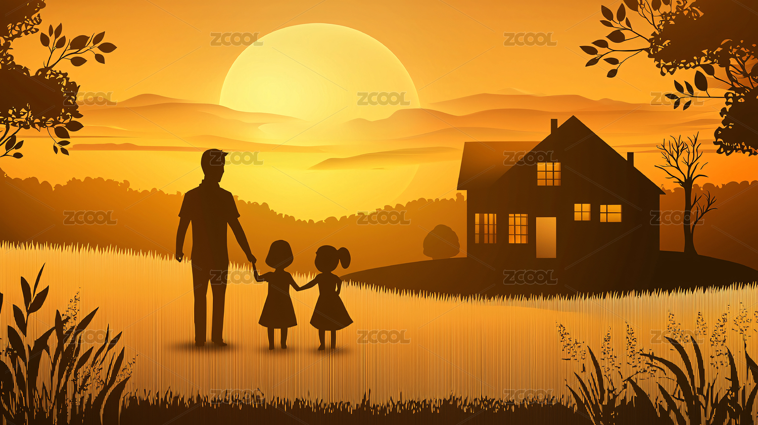 手牵手站在房子旁边剪纸风格家庭概念