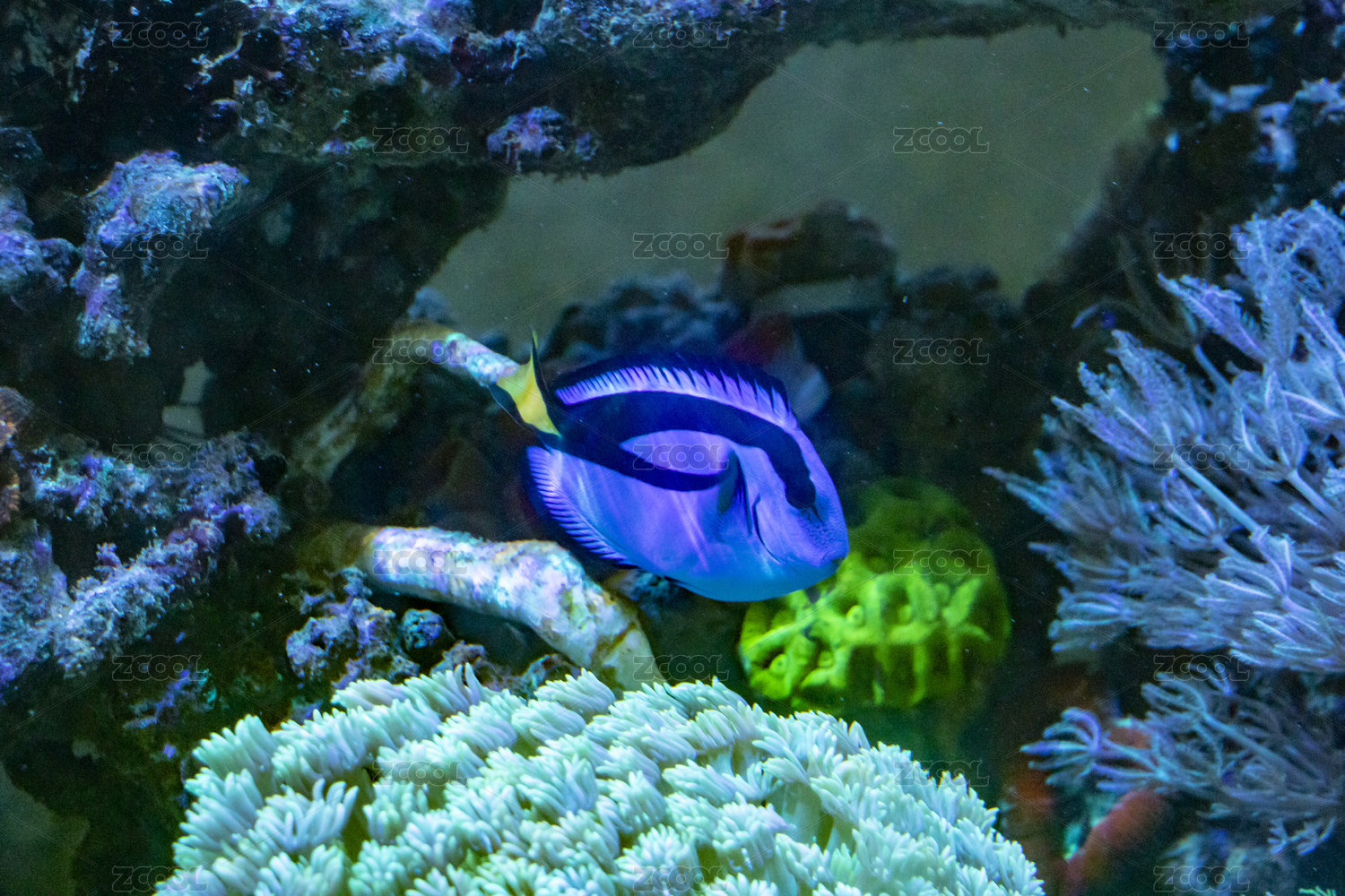 正在游动的蓝色身体带有深色花纹的蓝唐王鱼