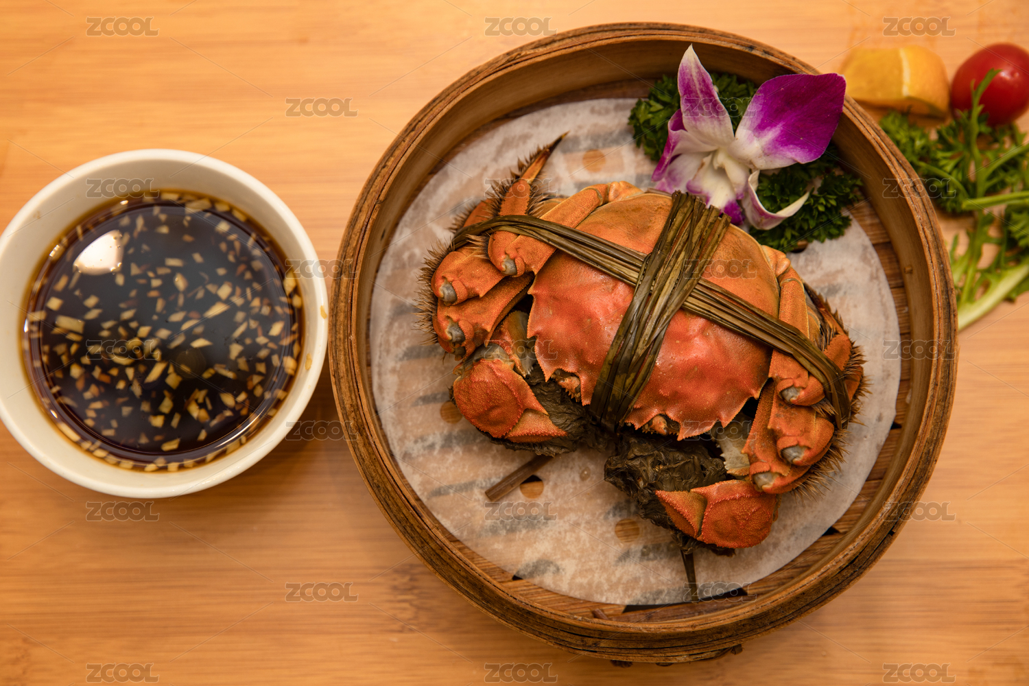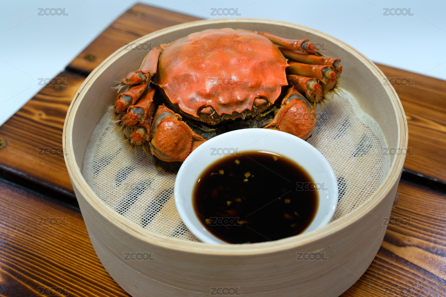 白色背景木质蒸笼里蒸熟的中华绒螯蟹