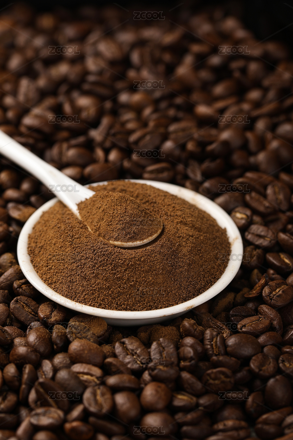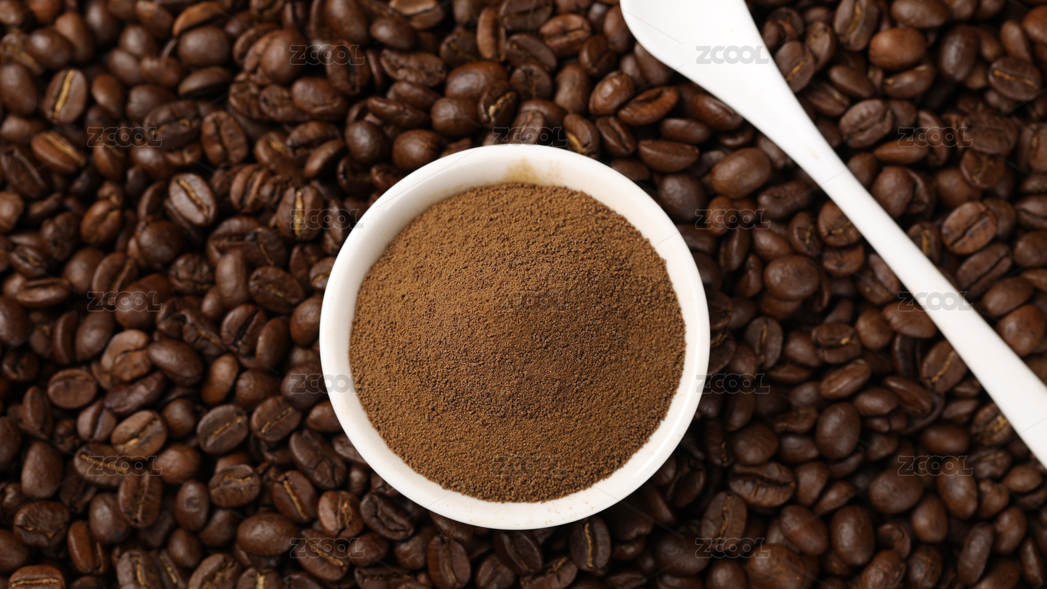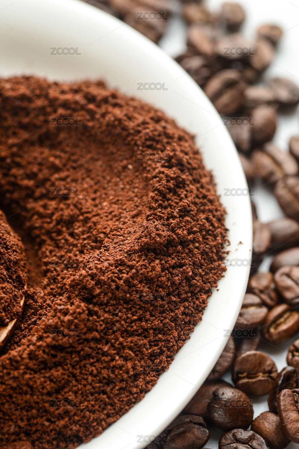 满满一碟咖啡粉放在咖啡豆背景上
