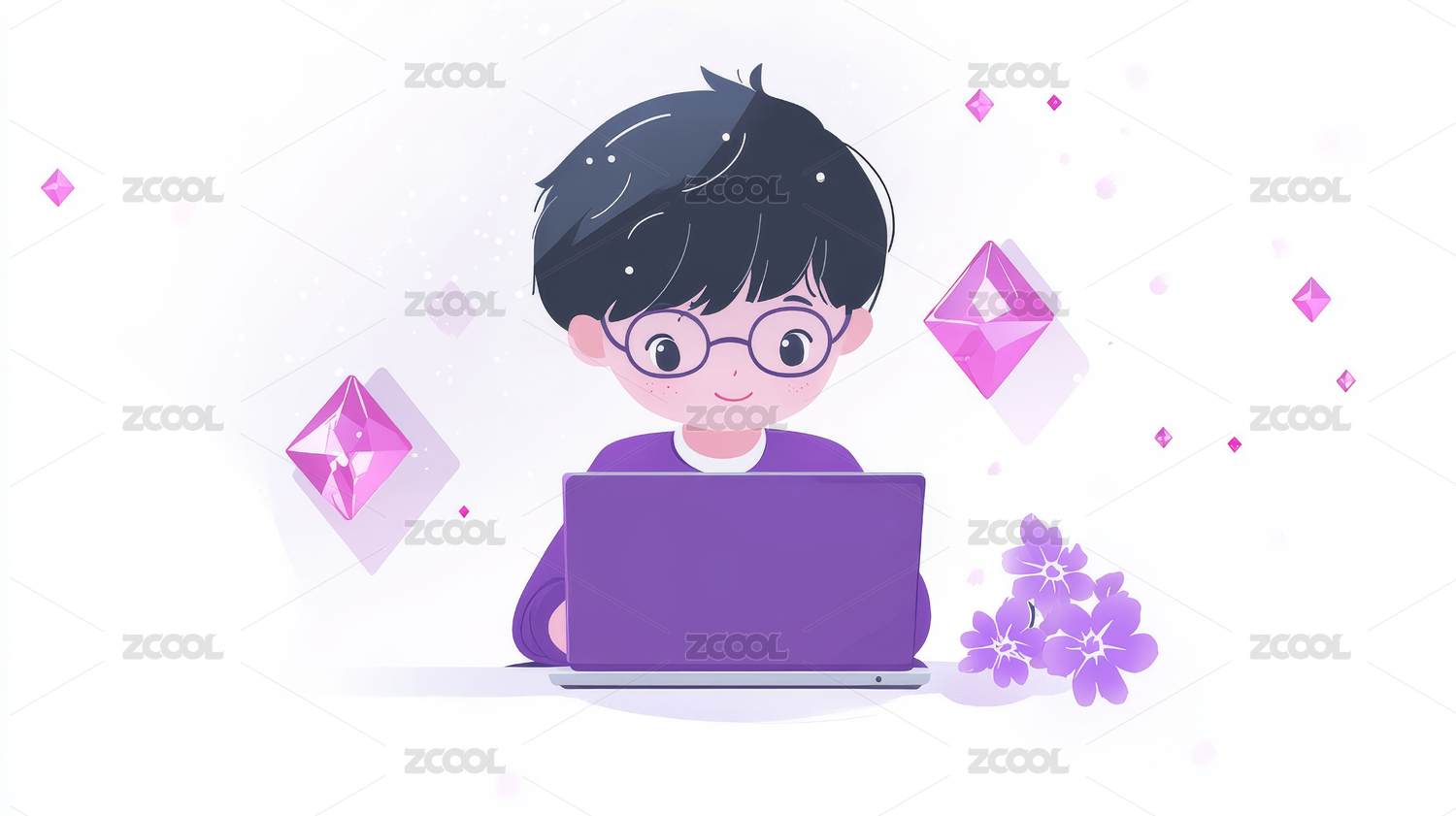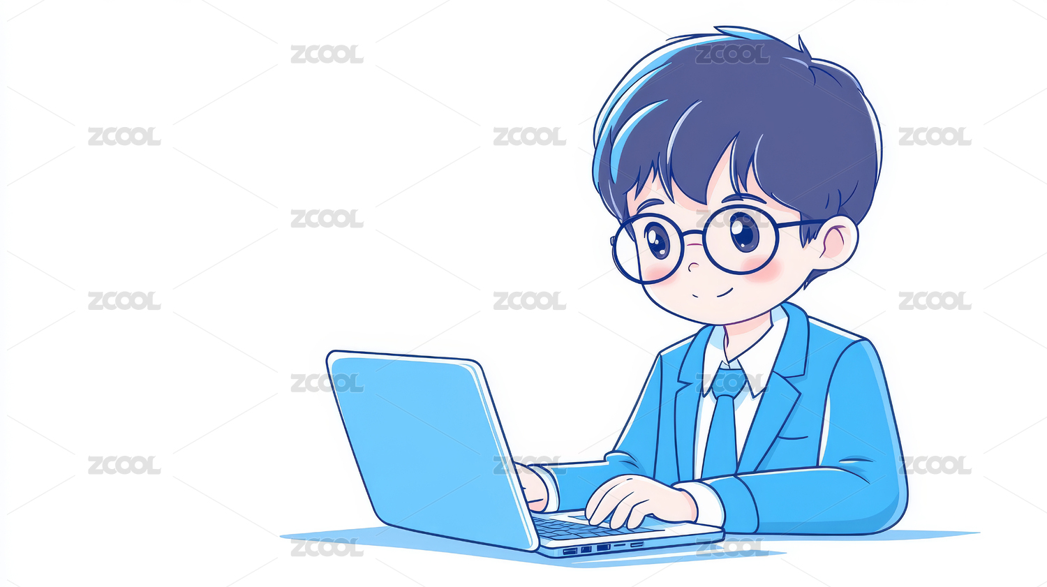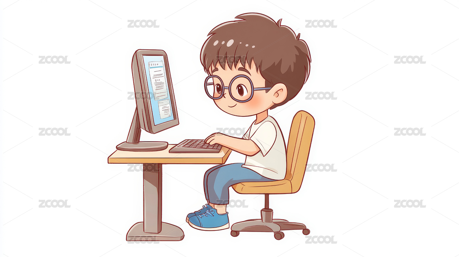 卡通男孩在椅子上手持笔记本电脑和盆栽植物