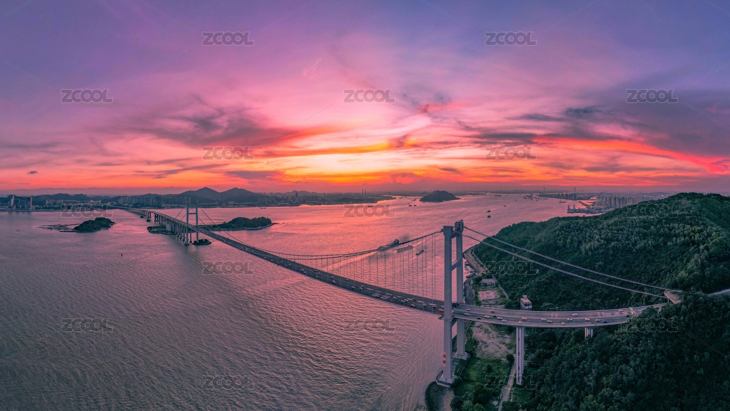 在晴朗的盛夏中,蓝天白云下壮观的浙江舟山西堠门跨海大桥
