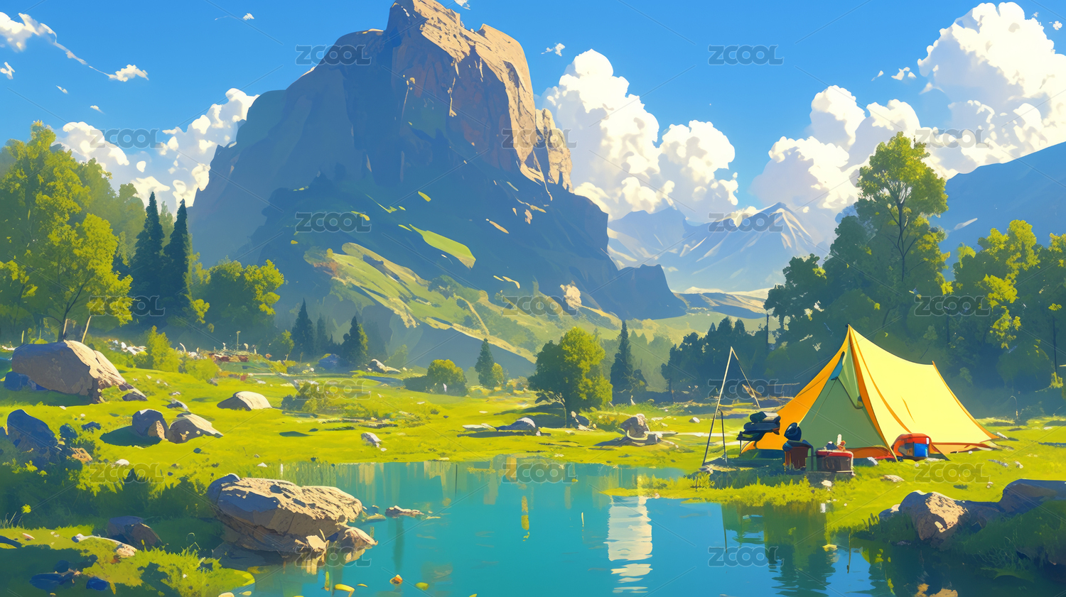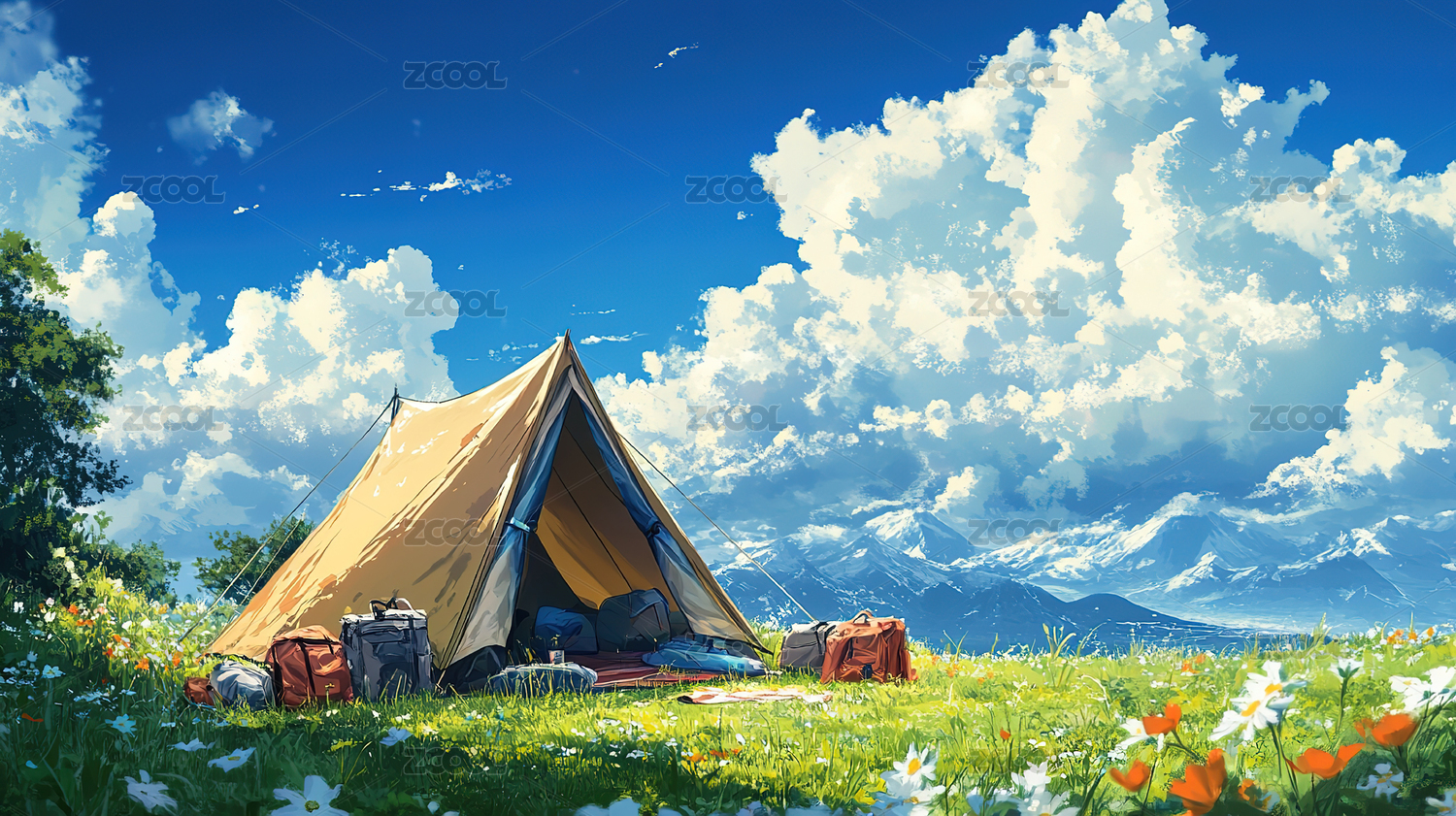 aigc,插画,帐篷,自然,宁静,草地,野花,平静,户外,山间