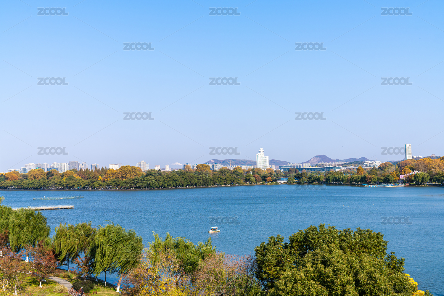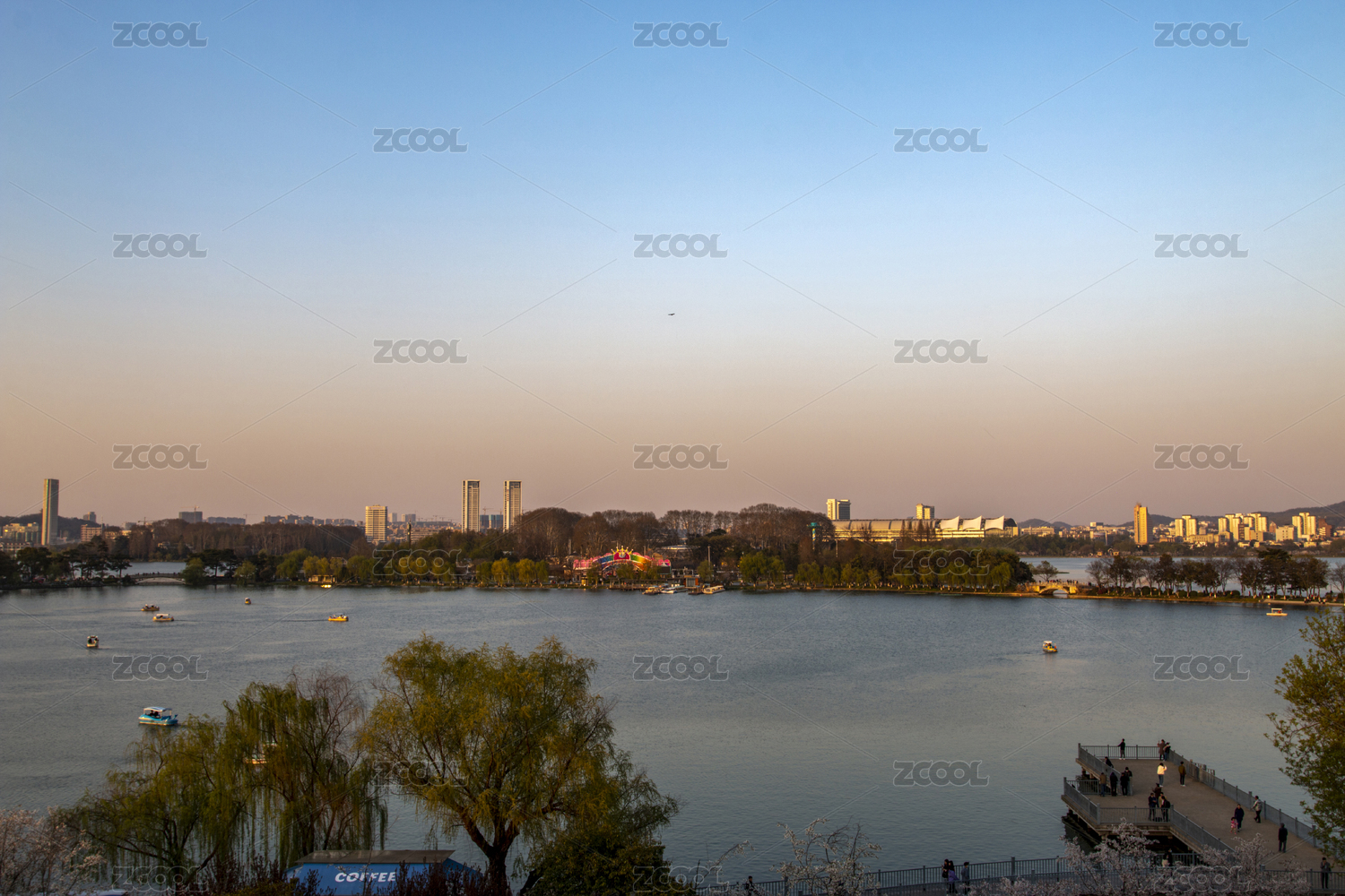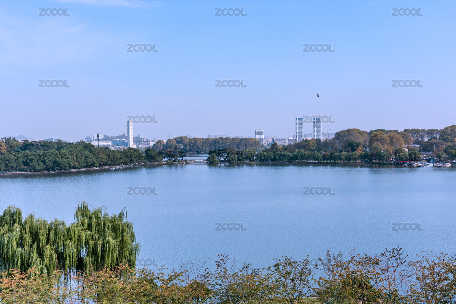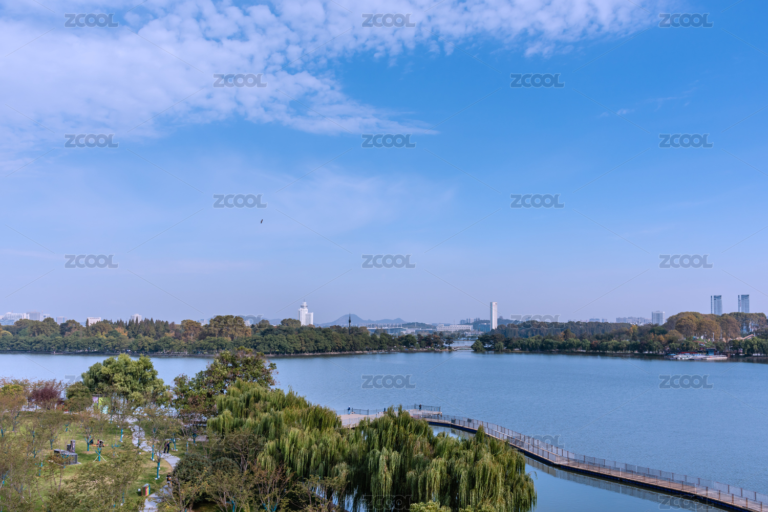 蓝天下的南京玄武湖全景与远处的南京火车站