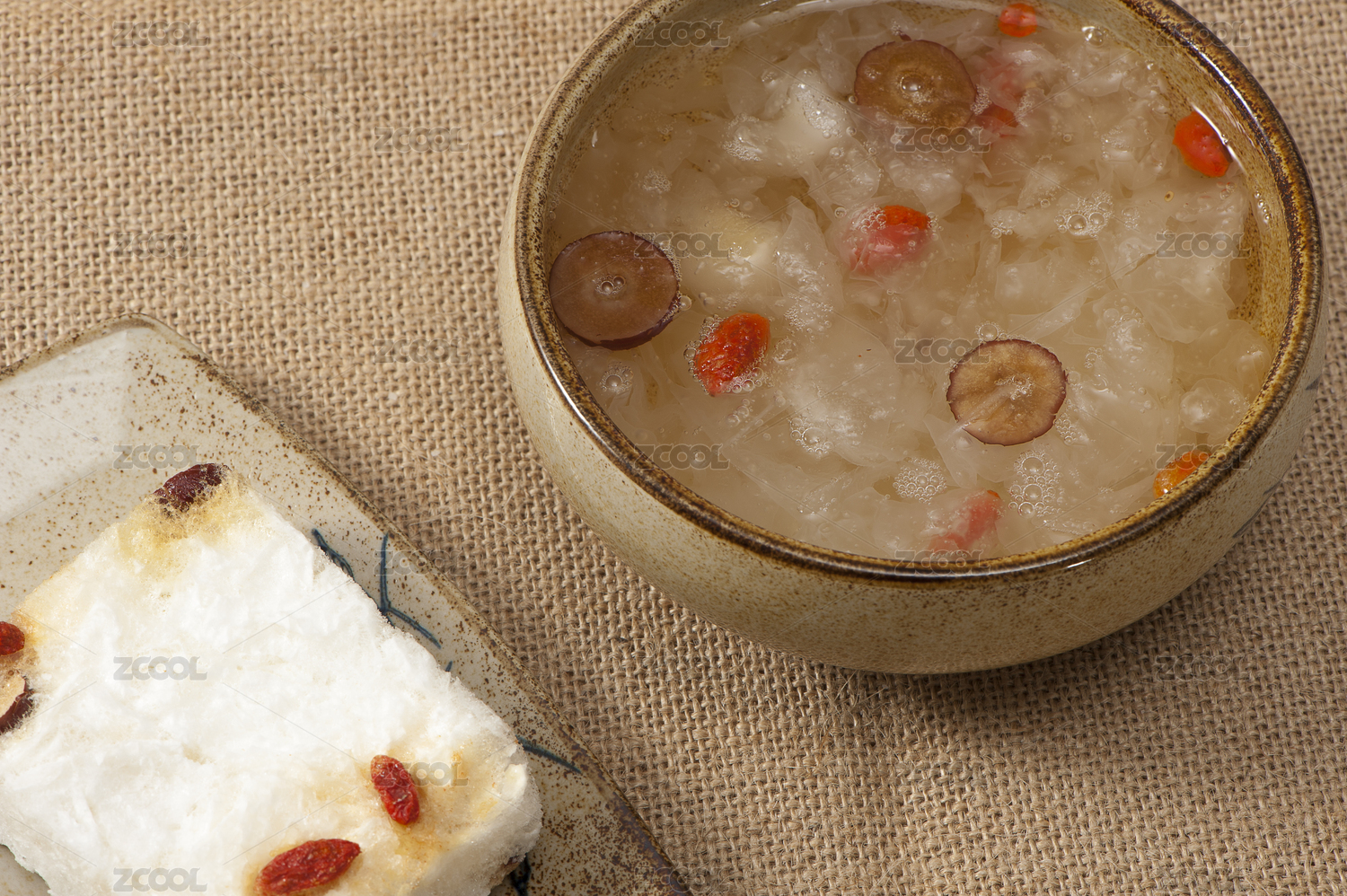 桌面上的盘子里的美味可口的冰糖炖桃胶