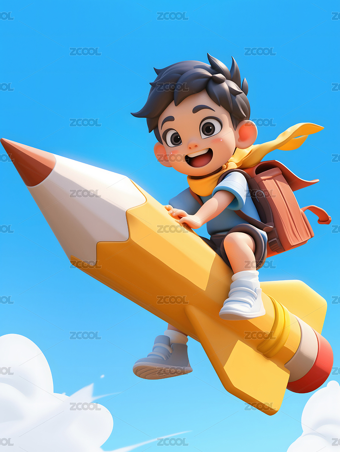 3D,三维,人物,卡通,角色,开心,大笑,书包,铅笔,飞翔