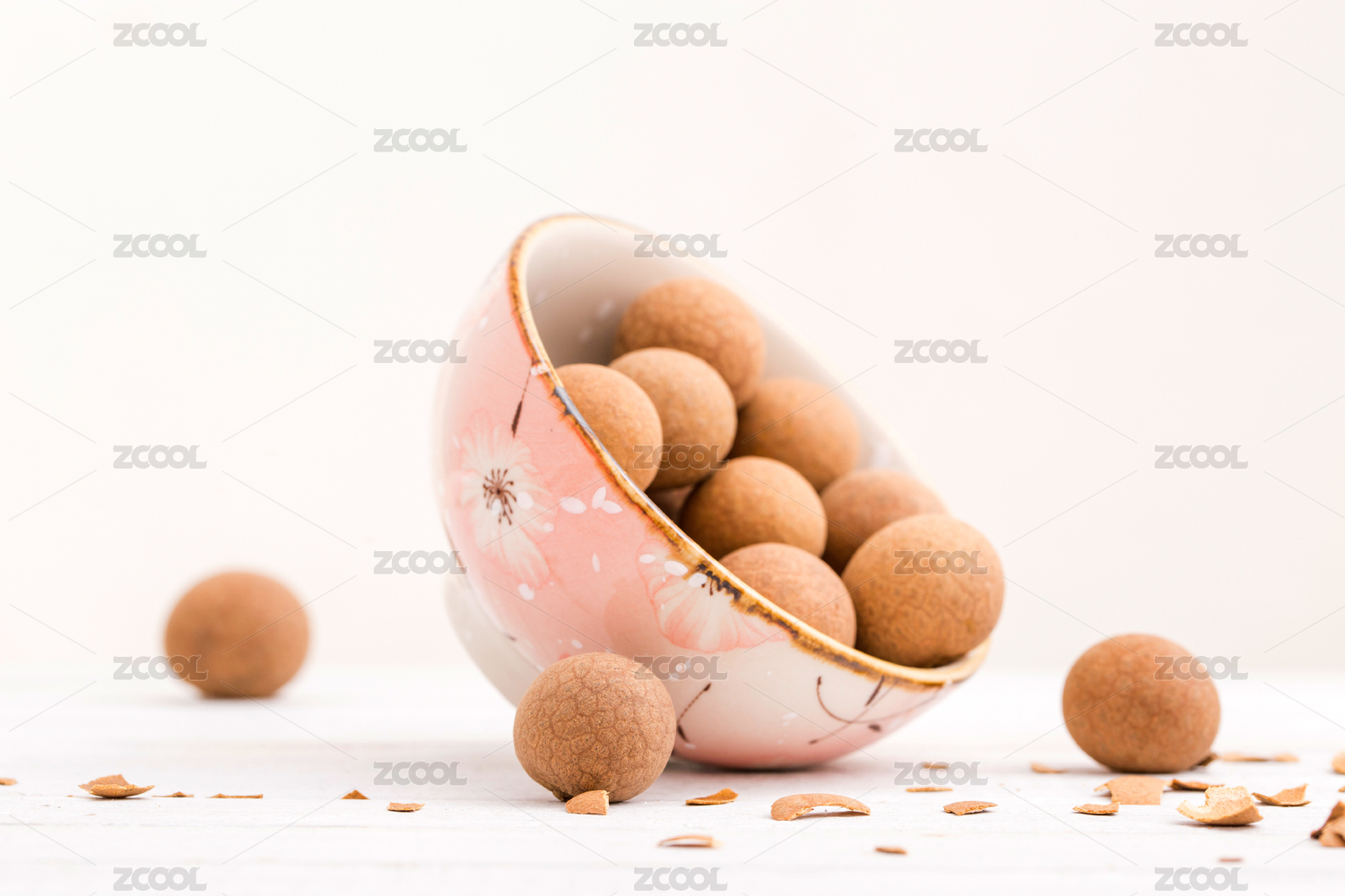 白色背景里展示拨壳的干龙眼