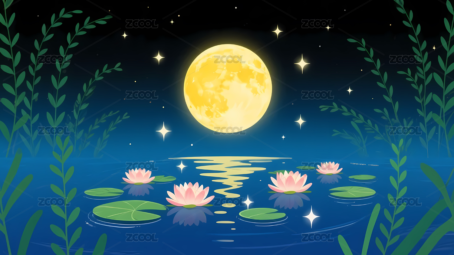 月亮下的荷花池 盛开的荷花和宽大的荷叶矢量插画