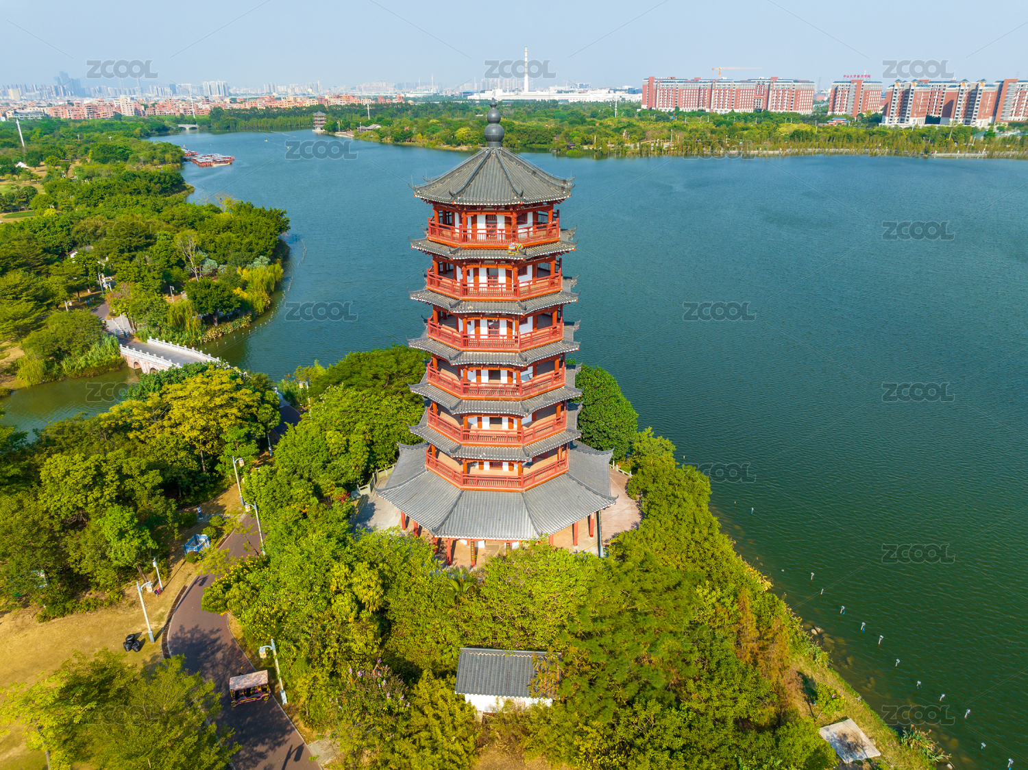 中国安徽省芜湖市湾沚区东湖公园楚风塔航拍风光