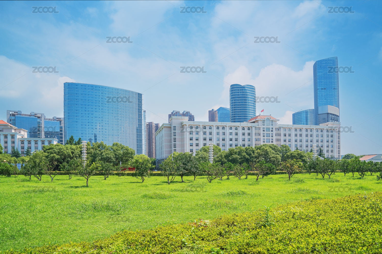 商业大楼与绿色草地