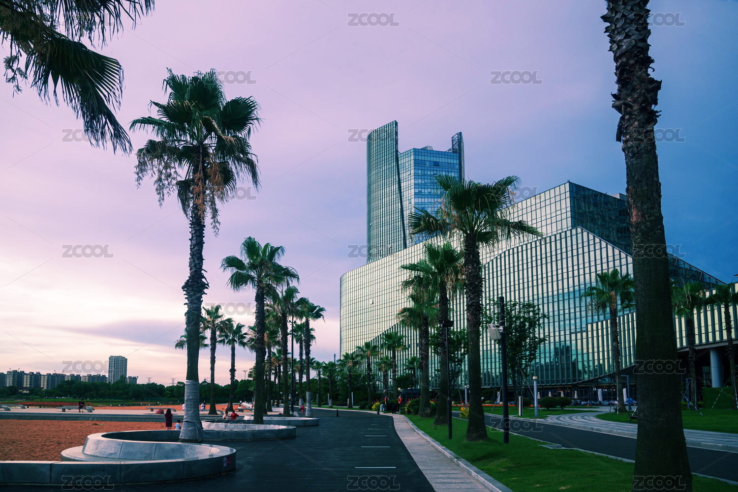 傍晚时分的浙江台州椒江市民广场的公园草地