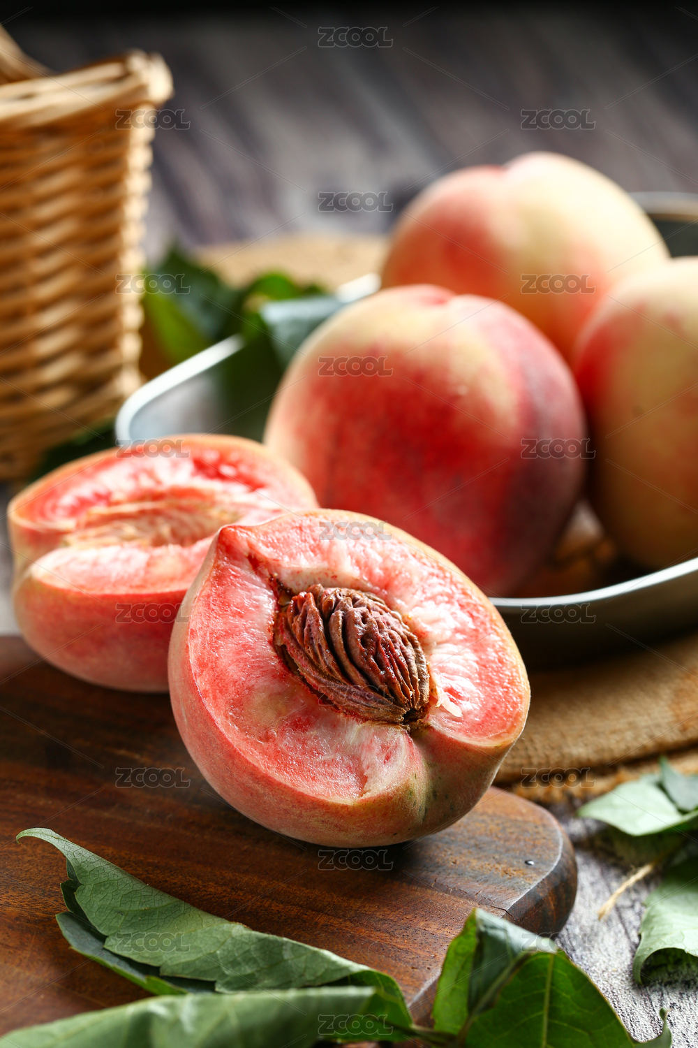 新鲜桃子掰开放在木板上