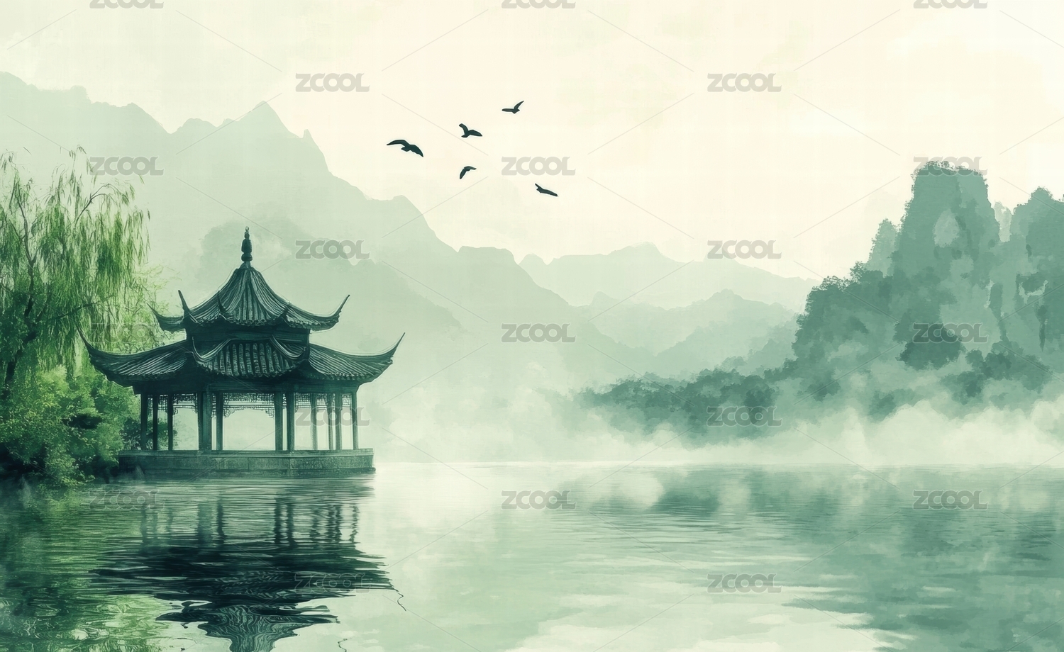 清明,江南,蓝色,荷花,荷叶,小船,远山,建筑,柳叶,湖面