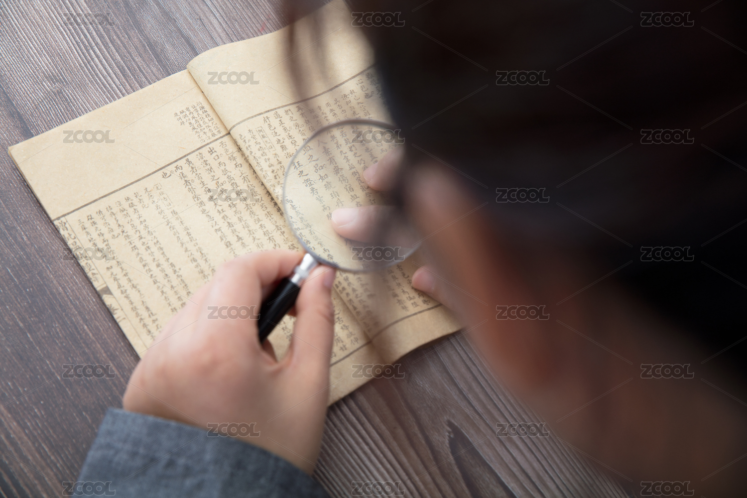 一位老年人手拿放大镜在一本泛黄的旧书上查询