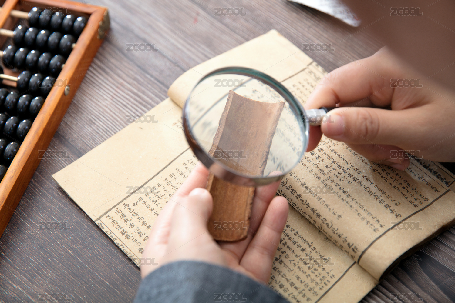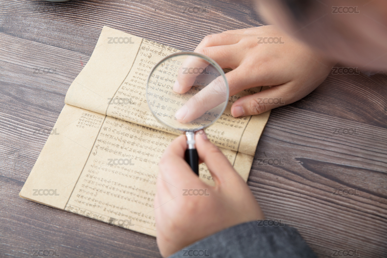 桌子上翻开的古旧泛黄的书籍和放大镜