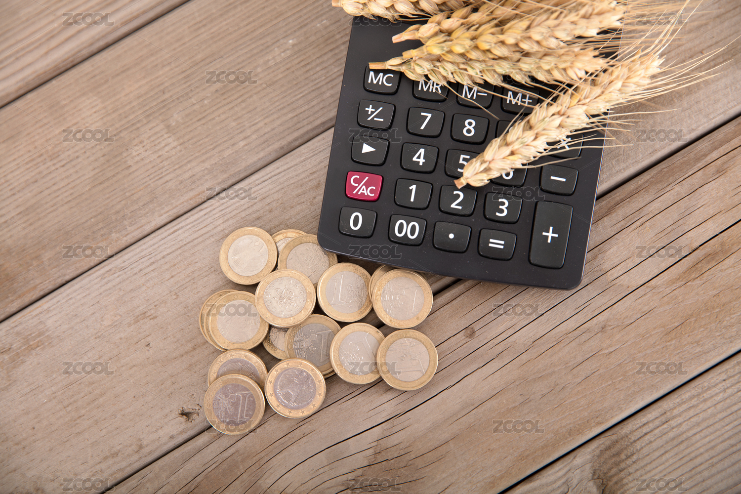 一个计算器及放在上面成熟的麦穗和旁边一堆欧元硬币
