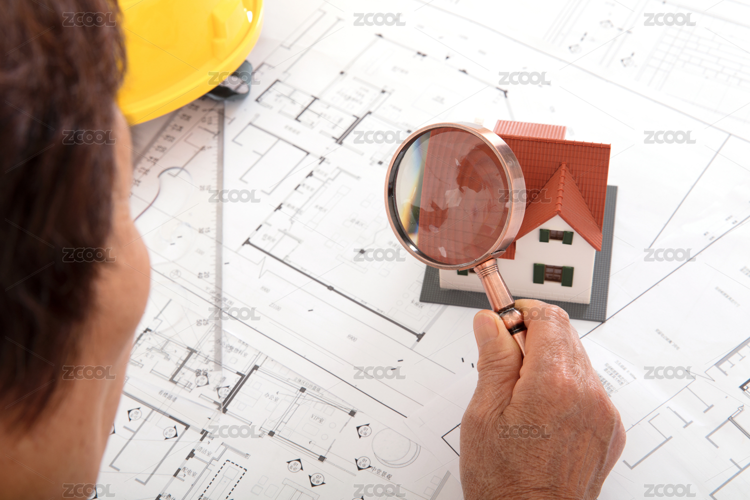 建筑工程师手摸图纸上的房屋模型另一只手拿放大镜观察图纸