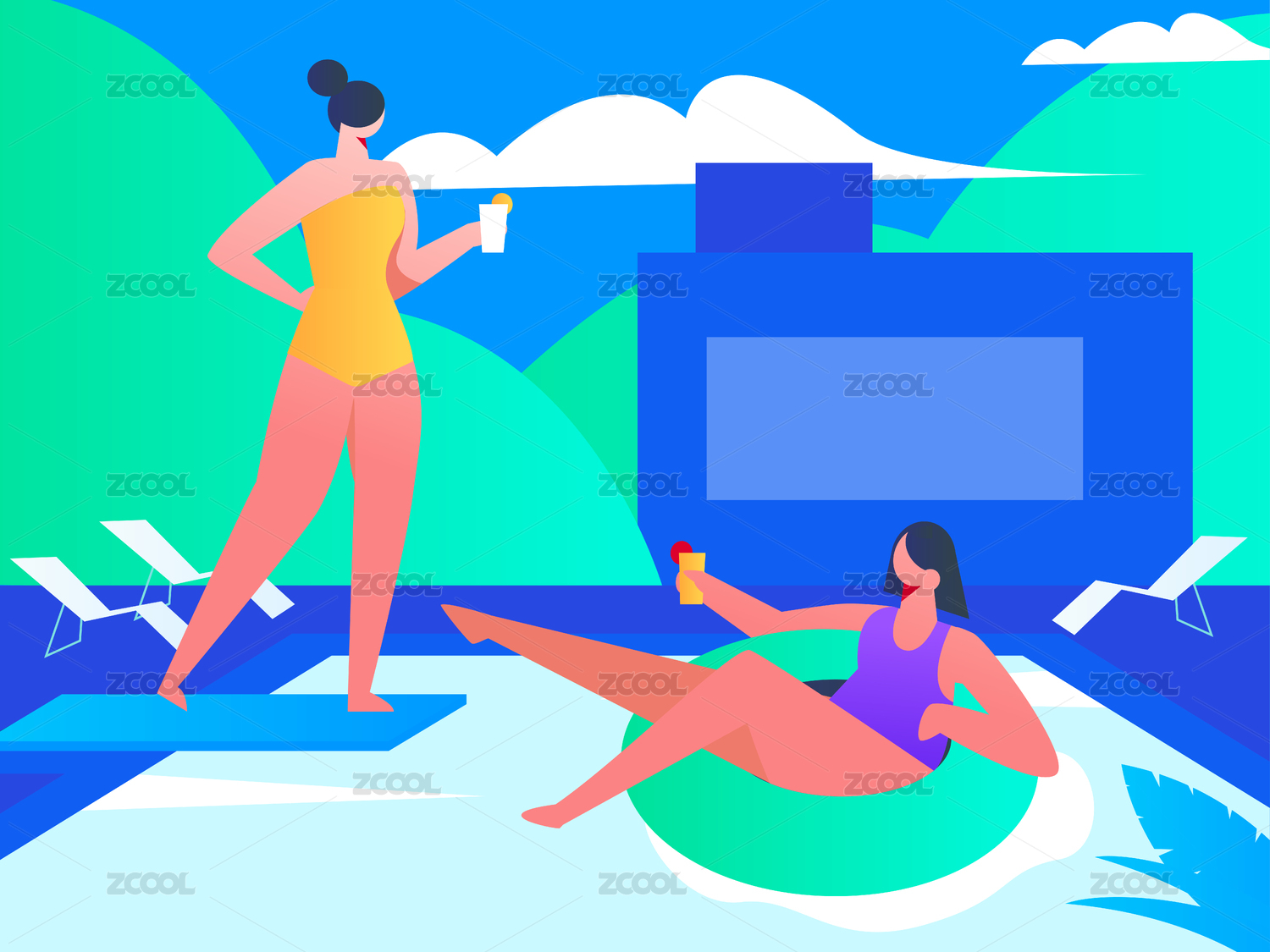 夏日泳池游泳度假手绘插画无缝壁纸背景
